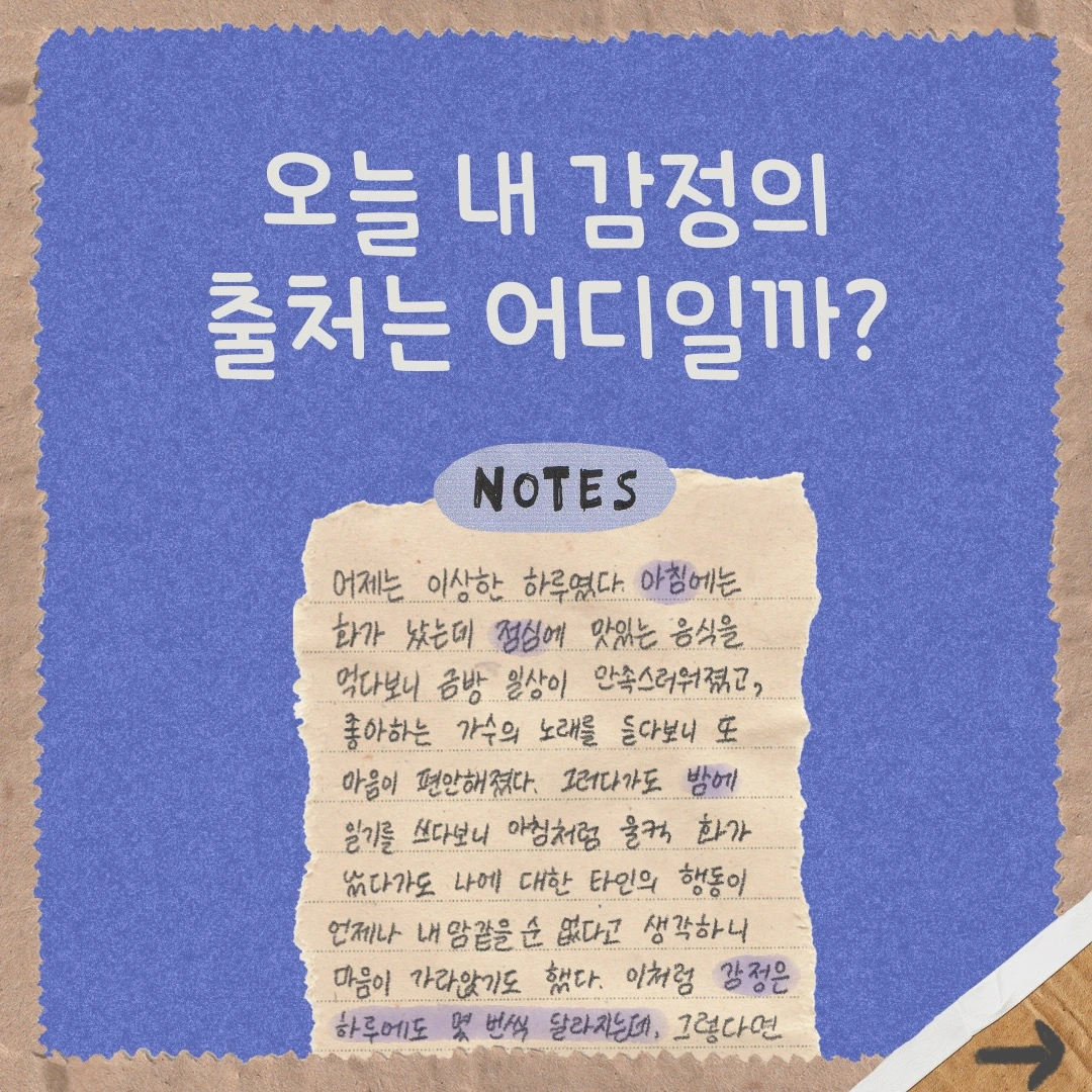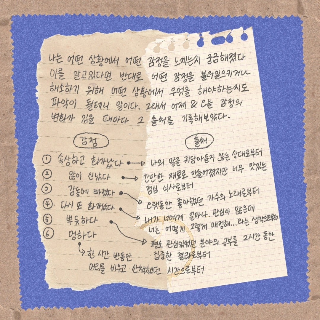이처럼 감정은 하루에도 몇 번씩 달라지는데, 그렇다면 나는 어떤 상황에서 어떤 감정을 느끼는지 궁금해졌다. 이를 알고 있다면 반대로 어떤 감정을 불러일으키거나 해소하기 위해 어떤 상황에서 무엇을 해야 하는지도 파악이 될 테니 말이다. 그래서 어제와 오늘 감정의 변화가 있을 때마다 그 출처를 기록해 보았다.