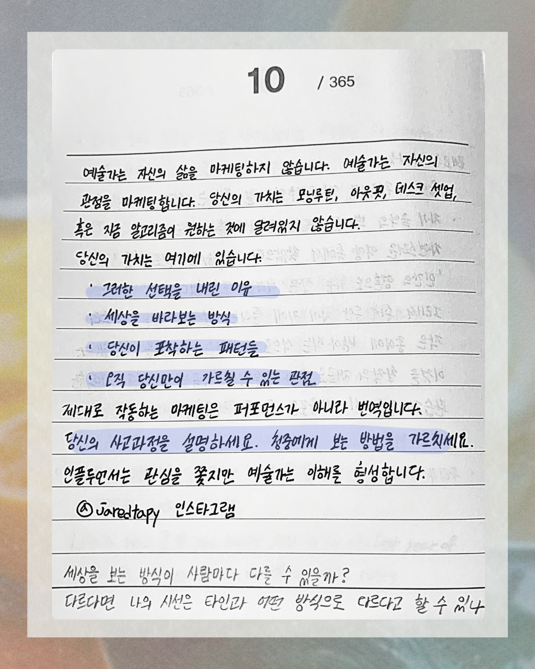 "예술가는 자신의 삶을 마케팅하지 않습니다. 예술가는 자신의 관점을 마케팅합니다. 당신의 가치는 모닝루틴, 아웃핏, 데스크 셋업, 혹은 지금 알고리즘이 원하는 것에 달려있지 않습니다.