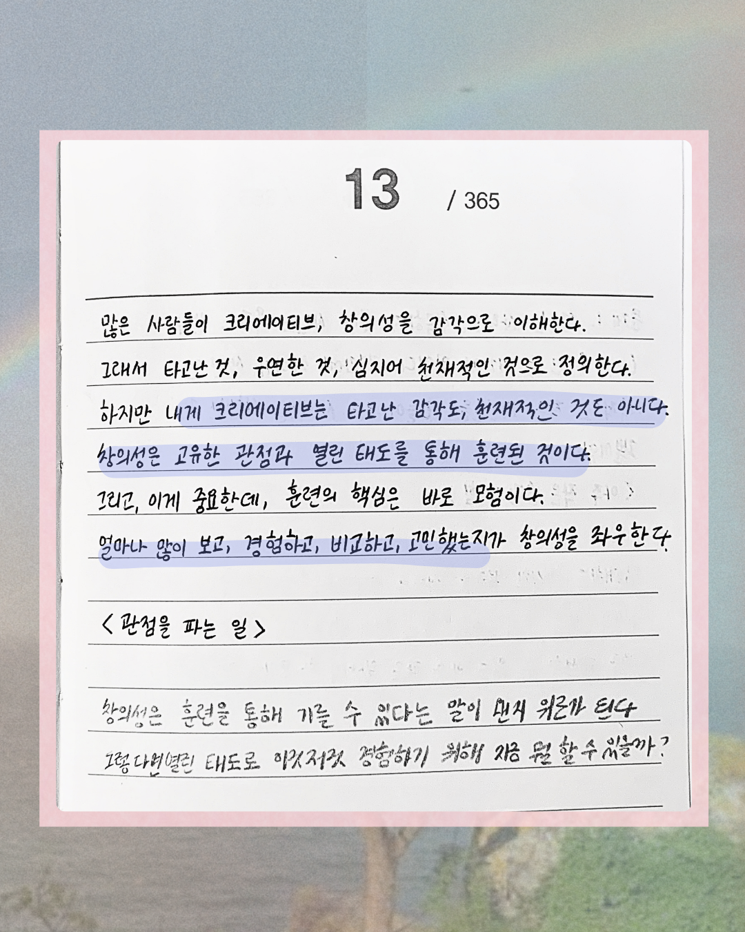 하지만 내게 크리에이티브는 타고난 감각도, 천재적인 것도 아니다. 창의성은 고유한 관정과 열린 태도를 통해 훈련된 것이다.