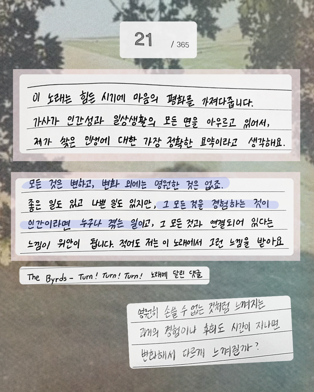모든 것은 변하고, 변화 외에는 영원한 것은 없죠. 좋은 일도 있고 나쁜 일도 있지만, 그 모든 것을 경험하는 것이 인간이라면 누구나 겪는 일이고, 그 모든 것과 연결되어 있다는 느낌이 위안이 됩니다. 적어도 저는 이 노래에서 그런 느낌을 받아요 “