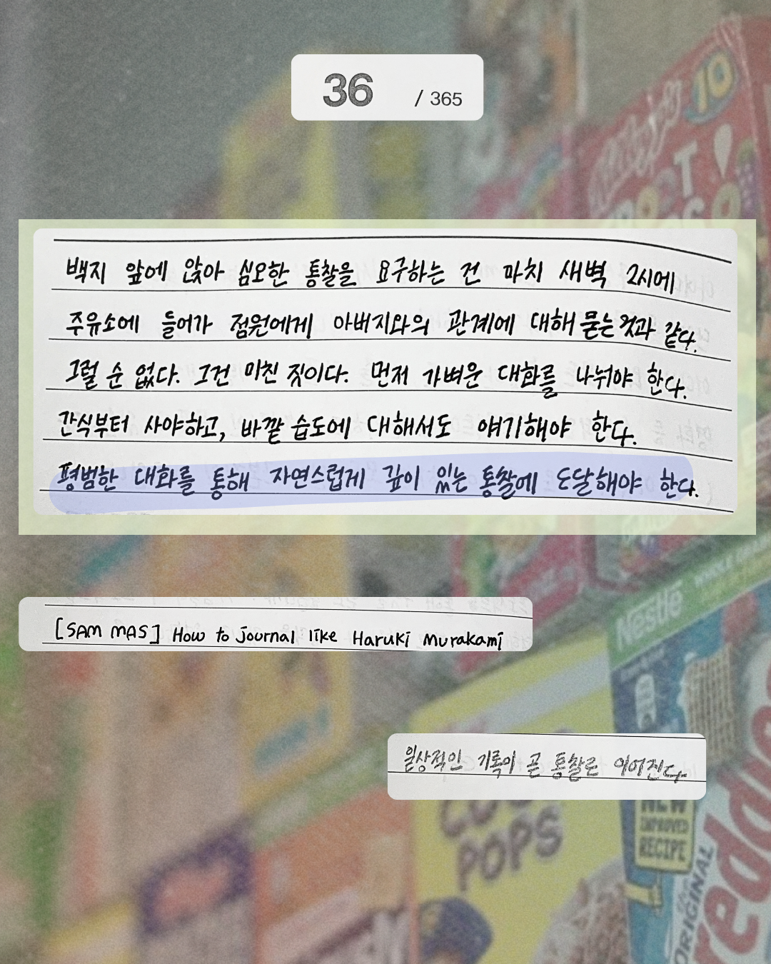 처음부터 거창한 결과를 낼 수는 없고, 세상의 어떤 심오한 통찰도 첫 시작은 일상적이고 가벼운 순간에서 비롯될 수 있다는 걸 알려준 문장. 매일 일기를 쓸 때, 일주일을 돌아보며 간단한 회고를 할 때 이 점을 염두에 둠으로써 빈 페이지의 막막함을 줄여보고 싶다.