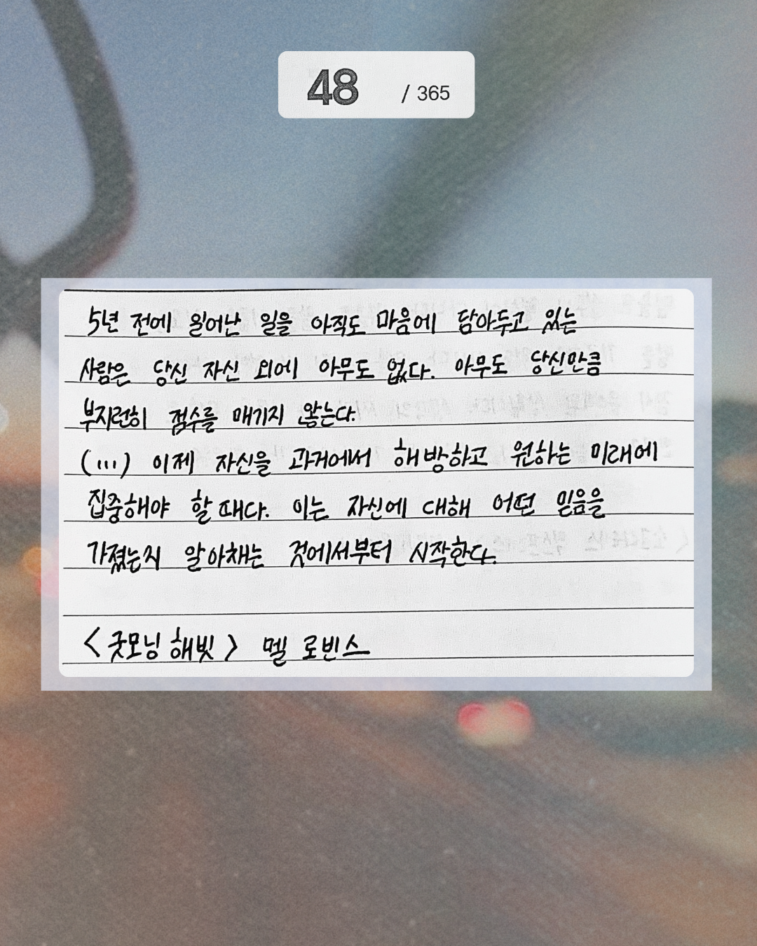 나의 과거에 대해 아무도 나만큼 열심히 관심 가지지는 않는다는 문장은 언제 다시 읽어도 정신을 차리게 된다. 과거는 여태 많이 돌아보았으니 이제는 미래를 설계해야 할 때라는 걸 계속 기억하고 싶다.