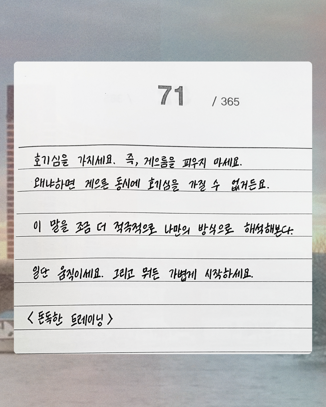 마음을 울리는 문장과 만나면 이를 그냥 지나치지 않고 나만의 해석을 더하는 지점이 흥미로운 문장. 게으름을 피우지 말고 호기심을 가지라는 말을 가볍게 시작하고 움직이라는 구체적인 실천 방법으로 재해석한 점이 좋다. 아무리 작게 시작해보고 싶더라도 시작점 앞에만 서면 왠지 망설여지기만 하는 습관과 다시 멀어질 동기부여를 준다.