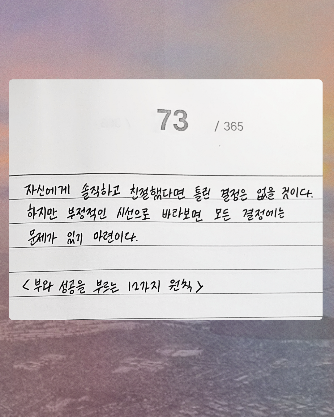 자신에게 솔직하고 친절했다면 틀린 결정은 없을 것이다. 하지만 부정적인 시선으로 바라보면 모든 결정에는 문제가 있기 마련이다.