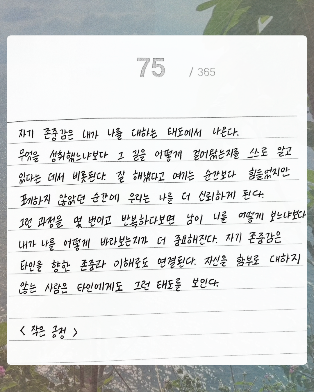 자기 존중감은 내가 나를 대하는 태도에서 나온다. 무엇을 성취했느냐보다 그 길을 어떻게 걸어왔는지를 스스로 알고 있다는 데서 비롯된다. 잘 해냈다고 여기는 순간보다 힘들었지만 포기하지 않았던 순간에 우리는 나를 더 신뢰하게 된다.