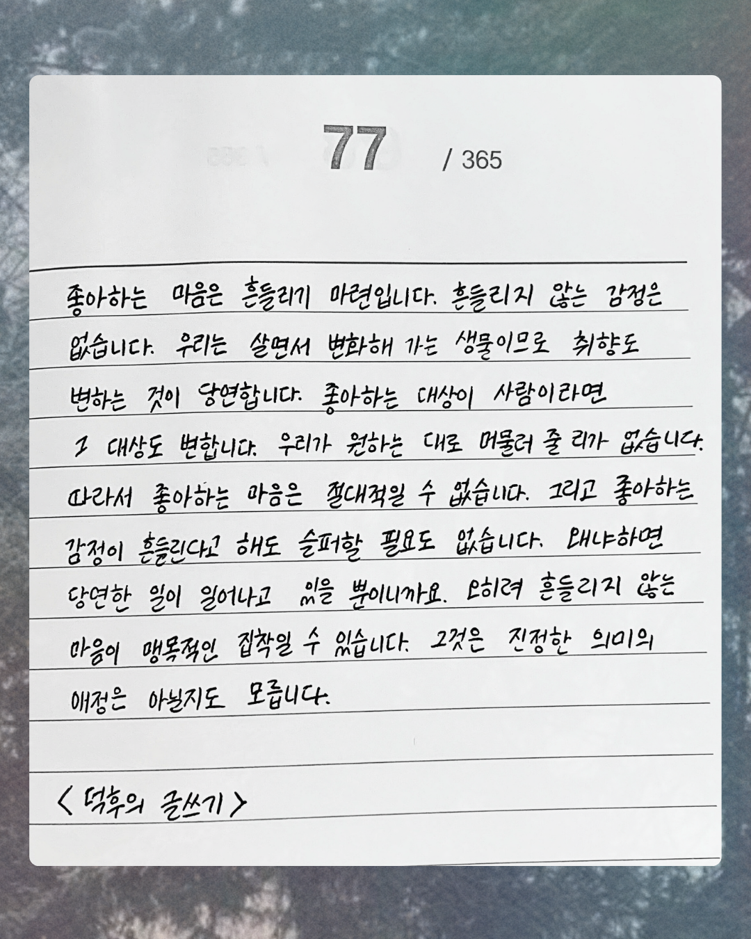 좋아하는 마음은 흔들리기 마련입니다. 흔들리지 않는 감정은 없습니다. 우리는 살면서 변화해 가는 생물이므로 취향도 변하는 것이 당연합니다. 좋아하는 대상이 사람이라면 그 대상도 변합니다. 우리가 원하는 대로 머물러 줄리가 없습니다.
