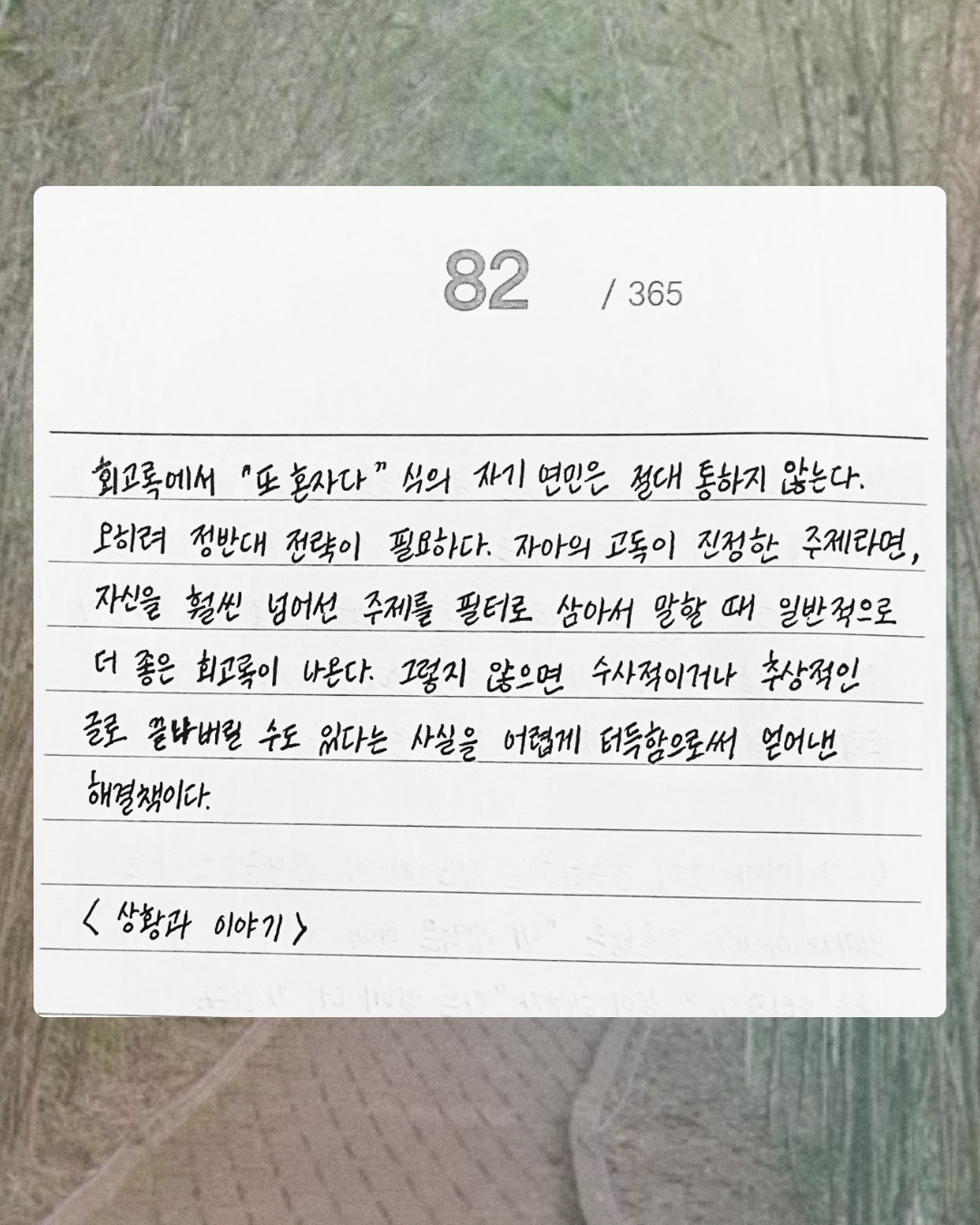 회고록에서 "또 혼자다" 식의 자기 연민은 절대 통하지 않는다. 오히려 정반대 전략이 필요하다. 자아의 고독이 진정한 주제라면, 자신을 훨씬 넘어선 주제를 필터로 삼아서 말할 때 일반적으로 더 좋은 회고록이 나온다. 그렇지 않으면 수사적이거나 추상적인 글로 끝나버릴 수도 있다는 사실을 어렵게 터득함으로써 얻어낸 해결책이다.
