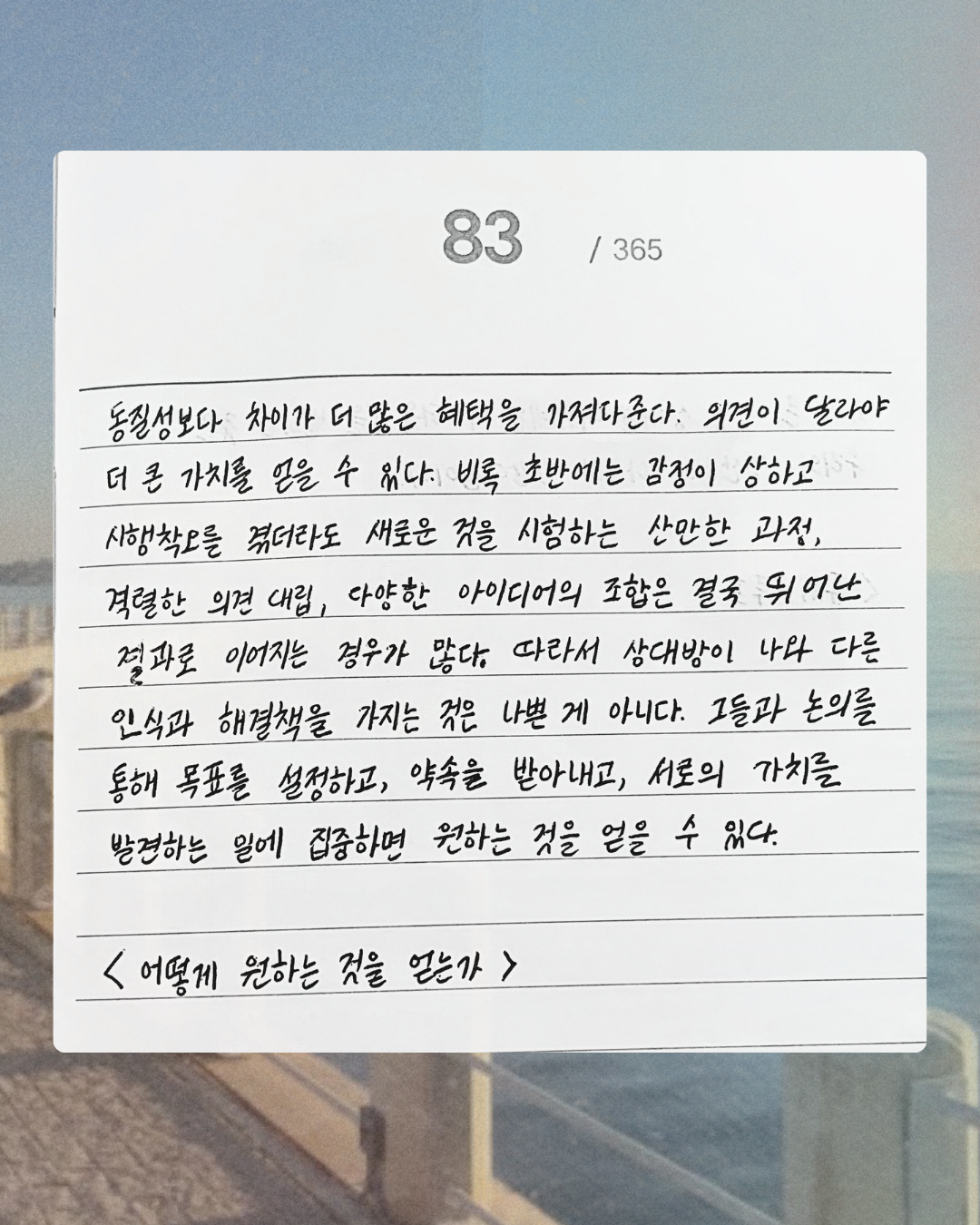 따라서 상대방이 나와 다른 인식과 해결책을 가지는 것은 나쁜 게 아니다. 그들과 논의를 통해 목표를 설정하고, 약속을 받아내고, 서로의 가치를 발견하는 일에 집중하면 원하는 것을 얻을 수 있다.