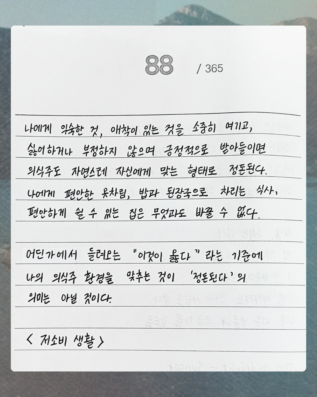 책 제목은 '저소비 생활'이었지만 저자가 진정으로 이야기하고 싶었던 주제는 '나다운 생활'이란 무엇인지에 관한 자신만의 관점 같았다. 주변 환경에 휩쓸리지 않고 내가 진정으로 편안하다고 인식할 수 있는 삶을 주체적으로 선택하는 모습을 책 곳곳에서 발견할 수 있어 인상적이었다. 남들에게 보여주기 위함이 아니라 내가 나를 위해 선택할 수 있는 삶의 태도는 무엇인지 책을 읽는 내내 저자와 함께 고민할 수 있었다.