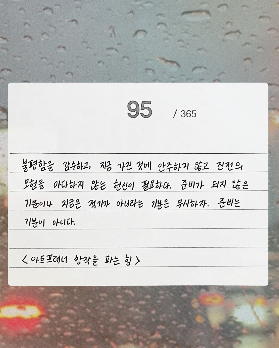 준비는 기분이 아니라는 문장은 간단하지만 굉장한 진실을 담고 있는 것 같다. 특히 요즘처럼 날씨가 좋은 봄날에는 꽃구경을 하고 하루하루를 즐기기에도 시간이 부족하기 때문에 매일 조금만 더 놀고 싶은 기분에 압도당하는 것처럼 느껴질 때가 있다. 이런 시기에 '준비는 기분이 아니다'라는 말을 접하니 괜히 마음 한 구석이 찔리는 한편, 흐트러진 생각도 다시 한번 다잡게 된다.