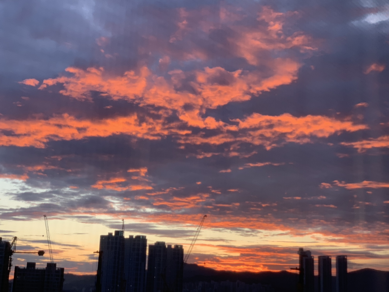 그런데 문득 핸드폰에서 눈을 떼고 바라본 창밖에는 해가 떠오르고 있었다. 전날 비가 내려서 커다란 구름이 하늘을 온통 뒤덮고 있었지만 그 와중에도 떠오르는 해는 그 두터운 하늘을 서서히 자신의 색으로 물들이고 있었다.