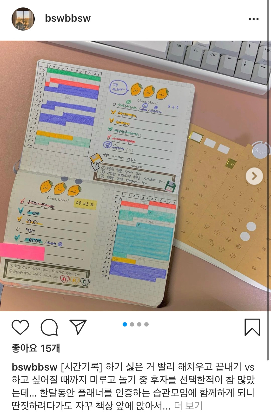 저도 이번 한 달 동안은 할 일에 온전히 몰입하는 습관, 나의 시간을 꾸준히 기록하는 습관을 들이고 이를 공개적인 곳에 올리기로 마음먹었습니다. 그래서 불렛 저널에 매일 시간을 기록하고 인스타에 업로드하고 있어요. 8월 한 달 동안 꾸준히 기록하기 위해 노력하겠습니다.