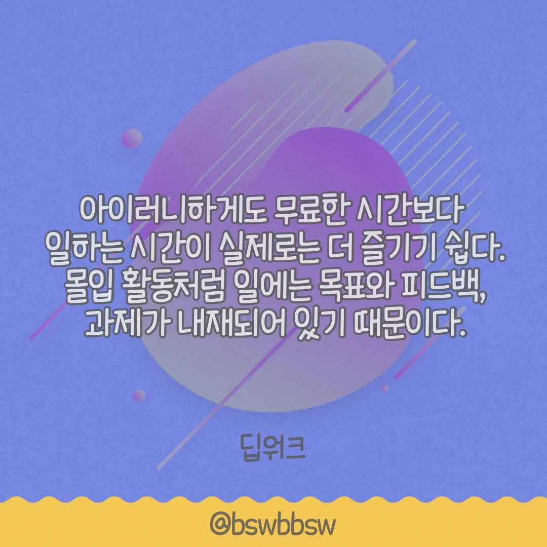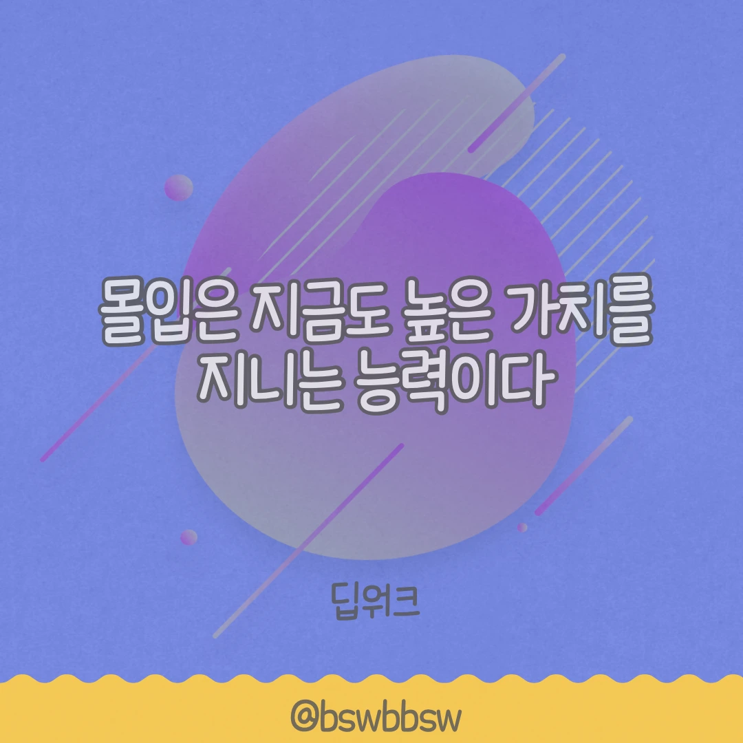 저는 딥워크를 읽는 내내 공부한다는 핑계로 카페에 갔다가 핸드폰만 만지작 거리다 집에 오는 지난날의 제 모습을 떠올렸습니다. '잠깐' 카톡을 확인하고 알림을 확인한다는 핑계가 한두 번씩 쌓이다가 결국 정말로 끝내야 할 일을 마무리짓지 못했던 경험이 제게만 있었던 건 아닐 겁니다. 그래서 오늘날에도 여전히 몰입은 중요하다는 메시지가 인상적이었어요.