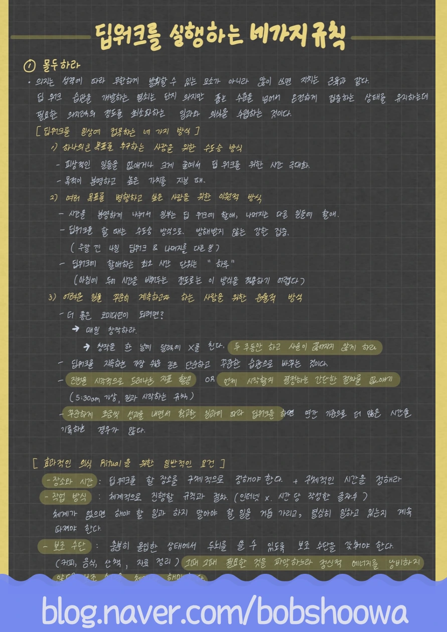 그중 1) 몰두하라 부분에서는 상황별 딥워크 실행법, 나만의 리츄얼을 만드는 법, 딥워크를 생성하는 방법론 등 지금 당장 실천할 수 있는 유용한 방법들이 자세하게 소개되어있었어요.