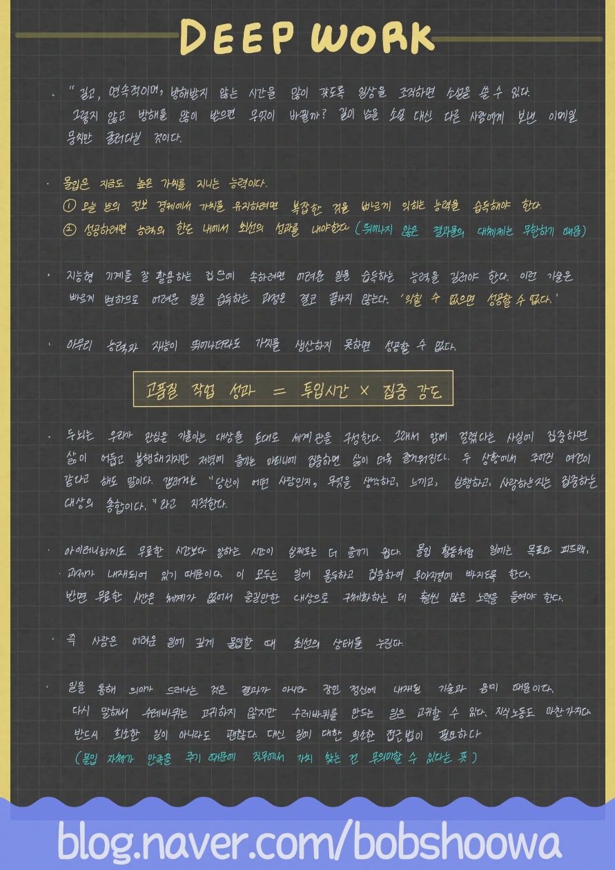 당신이 이루고 싶은 평생 소망은 무엇인가요? 사람마다 저마다 인생에서 꼭 이루고 싶은 소망이 있지만, 그것을 어떻게 하면 실제로 이룰 수 있을지 알고 있는 사람은 극히 드뭅니다. 어쩌면 책 딥 워크에서 보여주는 몰입의 힘이 평생 소망을 이루는 실마리가 되지 않을까 싶어요. 탁월한 성과로 돋보적인 사람이 되고자 하는 분들에게 이 책을 추천합니다.