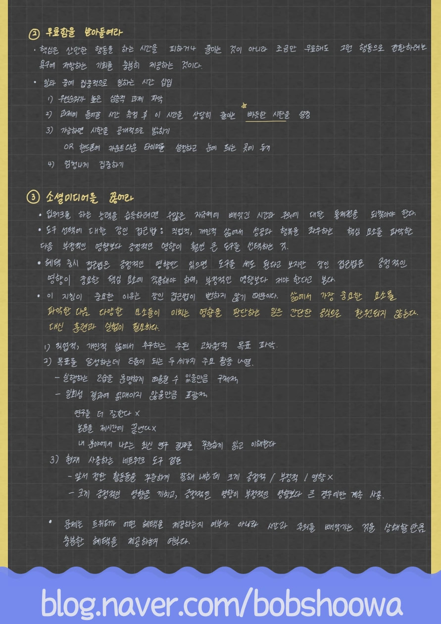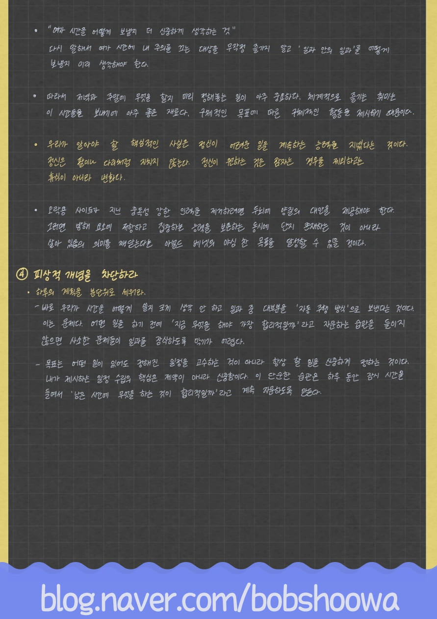 또한, 하기로 마음먹은 일을 다 하는 것보다 지금 이 순간 무엇을 해야 할지 신중하게 정하는 게 중요하다고 주장한 부분이 인상적이었습니다. 제가 계획 세우는 걸 좋아하면서도 실제로 그 계획을 모두 수행하는 걸 힘들어했던 이유도 '지금 무엇을 하는 것이 합리적인지' 생각하는 과정을 생략했기 때문인 것 같아요. 앞으로 더욱 생산적인 하루를 보내기 위해서는 신중하게 생각하는 습관을 들여야겠습니다.