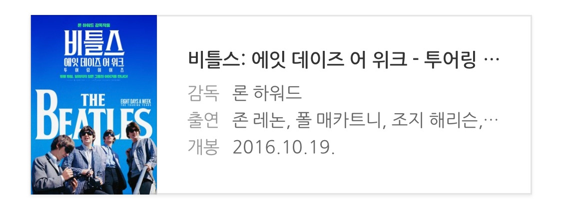 영화 엘비스는 보면 볼수록 마음이 아프기 때문에 비틀즈의 에잇 데이즈 어 위크로 그 마음을 달랠 수 있을 것이다. 물론 비틀즈의 끝도 썩 밝지만은 않지만… 그래도 기분전환하는데 제격인 영화임은 틀림없다.