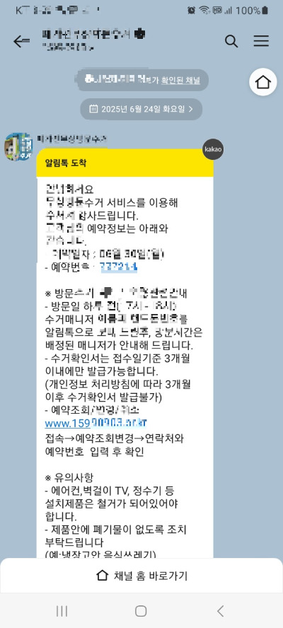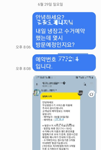 며칠 전, 무료 수거 접수를 마치고 하루 전날 오후 5~6시쯤 연락이 올 거라는 안내를 받았다.