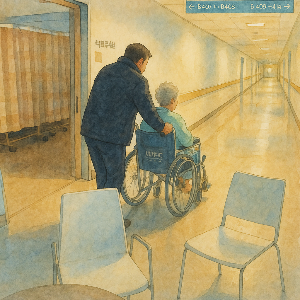 엄마는 세수를 하고 머리를 빗고, 옷을 입고, 외출 준비를 완벽히 마치고 있었다. 새벽부터 병원 검사가 잡혀 있던 날이었다. 나도 함께 가면 좋았겠지만, 무릎 통증이 다시 심해져 도저히 갈 엄두가 나지 않았다. 휠체어에 엄마를 앉히고, 신발을 신겨드렸다. 미안한 마음으로 “잘 다녀오세요”라는 말밖에 할 수 없었다.