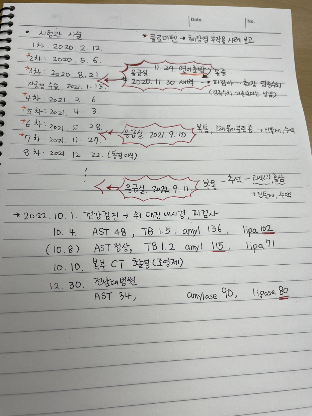 다행히 황달수치는 정상으로 돌아왔지만, 아밀라아제와 리파아제 수치가 정상치보다 살짝 높았다. 복부 CT를 찍고 나서, 다행히 췌장염이고 췌장이 부어있다는 소견을 들었다.