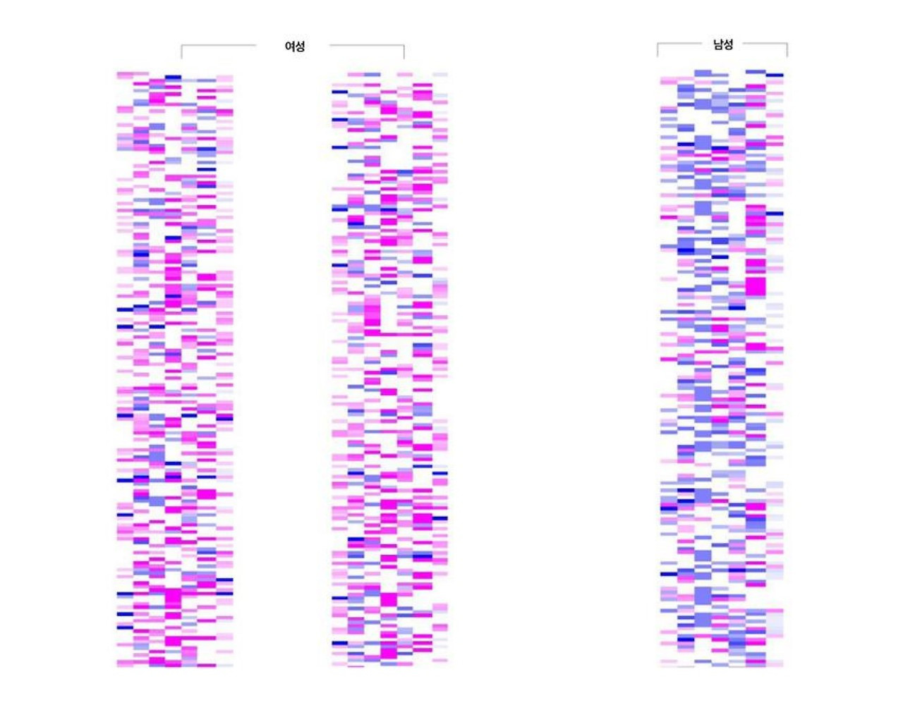 그나마 성차가 큰 10개의 영역을 선택했고, 각 영역 중 평균값이 여성이 더 크면 여성 측정치 중 제일 큰 1/3 범위를 ‘여자 쪽’, 남성 측정치 중 제일 작은 1/3을 ‘남자 쪽’, 두 범위 사이를 ‘중간’으로 정의 내린 후 281개의 영역을 다시 살펴보았다. 그 결과, ‘여자 쪽’, ‘남자 쪽’ 점수만을 가진 샘플은 고작 2퍼센트였고, 나머지는 ‘중간’, ‘여자 쪽’, ‘남자 쪽’의 혼합이었다. 특히 ‘여자 쪽’과 ‘남자 쪽’ 특징을 모두 가진 뇌는 약 1/3였다고 한다. 여자 쪽을 분홍색, 남자 쪽을 파란색으로 색칠했을 때, 많은 사람의 뇌는 분홍색과 파란색의 모자이크 조각들로 이루어진 다채로운 색을 보여준 것이다.