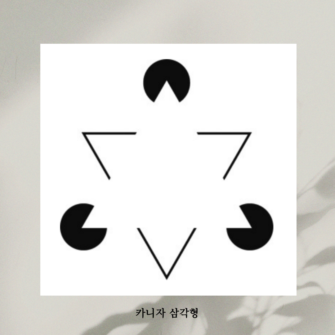 그림을 전체적으로 바라보자. 이 글을 읽는 당신이라면 반드시 가운데에 있는 하얀 정삼각형을 보게 될 것이다. 흐린 눈을 하고 삼각형을 주변시야에 두거나 억지로 시야를 좁혀 검정 부분에만 집중하지 않는 이상 하얀 정삼각형을 보지 않기란 어렵다. 그러나 하얀 삼각형을 구분 짓는 선은 어디에도 없다. 우리가 환영과도 같은 이 삼각형을 보는 이유가 뭘까? 우리에게 삼각형이라는 사전 지식이 있기 때문이다. 이러한 형태의 정보가 주어졌을 때 가장 가능한 해석이 곧 하얀 삼각형을 보는 것이다. 빨간약을 먹은 후에 이전 상태로는 다시 돌아갈 수 없는 것처럼 삼각형을 배운 적 없는 어린 아이나 동물은 절대 볼 수 없는 하얀 삼각형 환영은 우리를 끈질기게 쫓아온다.