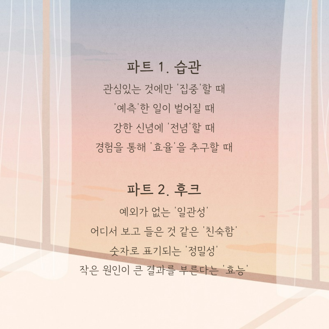 목차가 예쁘게 잘 뽑혀 있다. 파트 원에서는 우리의 인지적 습관을 중심으로 우리가 어떠한 행동을 할 때 속기 쉬운지 경고한다. (이 책에서 절박함이나 소속감의 욕구, 친화적 성향과 같은 동기나 감정, 성격에 대해서는 거의 언급하지 않고 인지적 특성을 중심으로 이야기한다.) 파트 투에서는 사기에서 주로 보이는 속성을 분석한 후, 이를 마음의 사탕과 같은 역할을 하는 '후크'라고 명명했고 이것들이 나타나면 주의하라고 말한다.