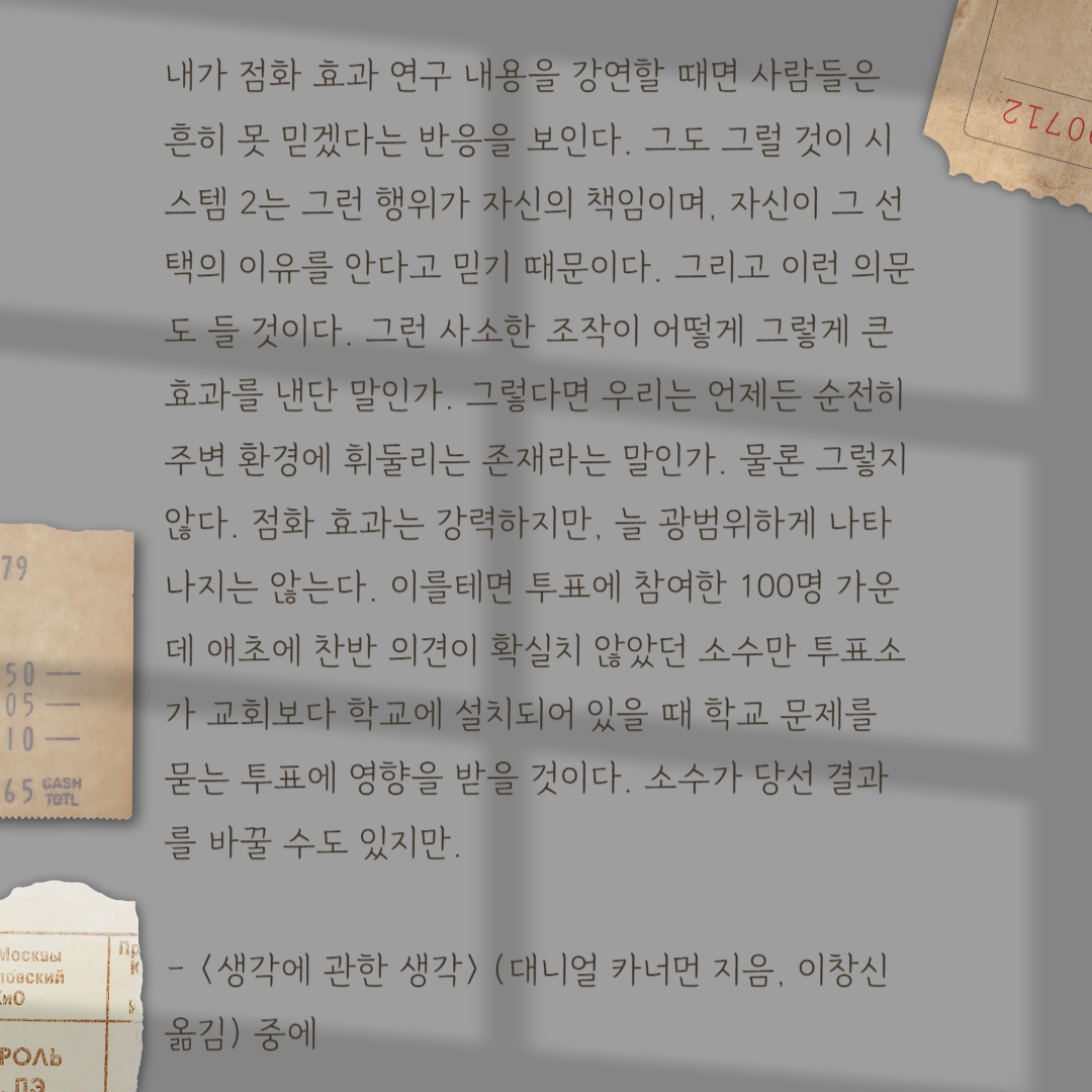 이렇듯 알아차리지 못할 만큼의 미묘한 환경 조작이 우리에게 상당한 영향을 미친다면 우리가 생각하는 것보다 행동과 결정에 대한 우리의 통제력은 훨씬 작을 수 있다는 의미이기에 가히 충격적인 결과라 할 수 있다. 카너먼은 이 증거가 얼마나 강력한지 확신에 차서 다음과 같이 말한다. "집중해야 할 점은 불신은 선택지가 아니라는 것이다. 이 결과는 만들어낸 것도, 통계적 우연도 아니다. 이런 연구의 주된 결론이 사실임을 받아들이는 것 외에 다른 선택지는 없다. 더 중요한 것은 이런 결론들이 당신에게도 적용된다는 것을 받아들여야 한다는 점이다.(<당신이 속는 이유>에서 발췌)."