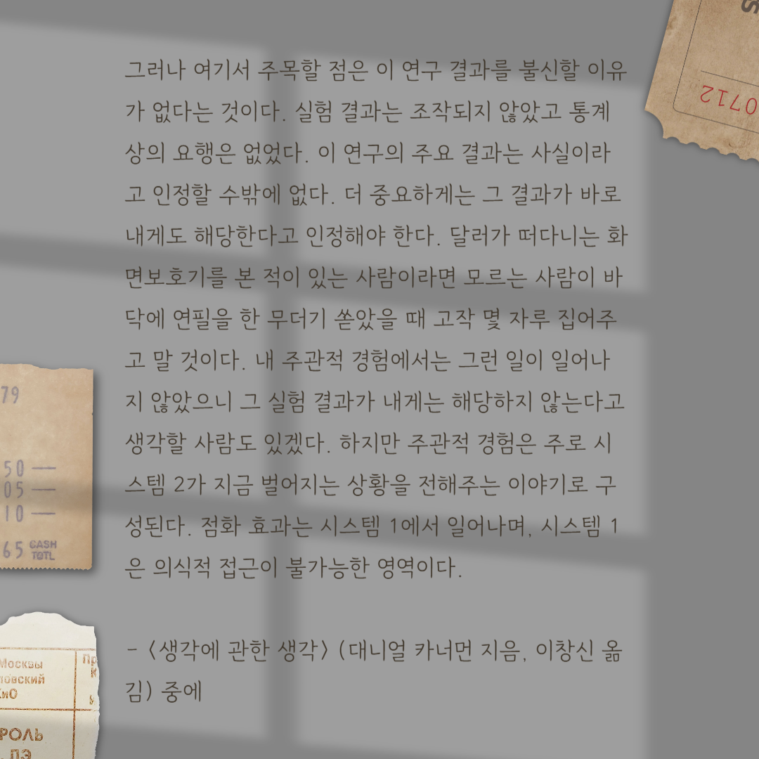 보다 생생하게 카너먼의 저서 <생각에 관한 생각>에 나온 내용을 옮겨 본다.
