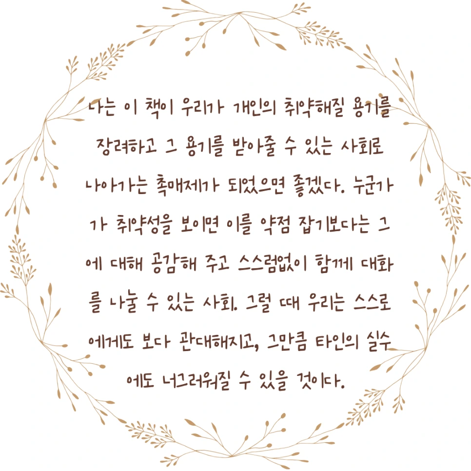 취약성 드러내기는 듣는 이를 전혀 고려하지 않고 감정의 쓰레기통인 양 다 쏟아낸다는 것이 아니라는 전제 하에서, 상대에게 우리 함께 서로의 부족함을 드러내고 얘기해도 괜찮다고 초대하는 행동이자, 상대에게서 위로와 공감, 수용을 이끌어 낼 수 있는 행동이기도 하다(보통은 후자가 먼저라고 생각한다). 어린아이들과 다를 바 없이 우리는 안전하고 따뜻한 수용적 환경 속에서 자신의 부족한 모습을 진정으로 끌어안을 수 있다. 덧붙이자면, 자신의 취약성을 받아들이지 못하면 당연한 논리적 귀결로 타인의 취약성 또한 진실로 받아들이기 어렵다(남의 취약성 드러내기는 받아주지만 자기 이야기는 꺼린다면 '남은 나만큼 중요하지 않으니 상관없다'에 가깝다고 할 수 있다).