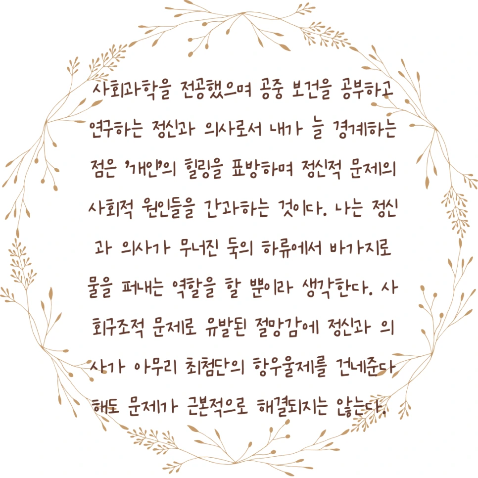 물론 나도 상담자로서, 결국 상황이 바뀌기보다는 개인이 할 수 있는 것을 함께 고민할 수밖에 없다는 것을 아주 잘 안다. 거시적인 상황이 바뀌지 않아 나도 바뀔 수 없다는 태도는 무력감만을 가중시킬 수 있다. 그렇다고 해서 개인이 할 수 있는 일에 대해서만 주야장천 이야기하는 것은 우리가 진공 속에 있거나 단지 미시적 환경에만 영향을 받는 존재가 아닌데 어쩐지 너무 중요한 이야기를 배제해 버리는 것 같다는 생각을 떨칠 수가 없다. 특히나 자신의 탓만을 하는 개인에게 사회적 구조에 문제의식을 가질 수 있도록 독려하고(이에 작게나마 영향을 미칠 수 있는 크고 작은 계획을 함께 세울 수 있다면 그것도 좋을 것이고), 더 나아가 사회를 이루는 책임 있는 개인이자 정신건강 종사자로서 자신이 할 수 있는 만큼 사회적 연결과 안전망을 촉진할 수 있는 노력을 기울여야 한다고 생각한다.
