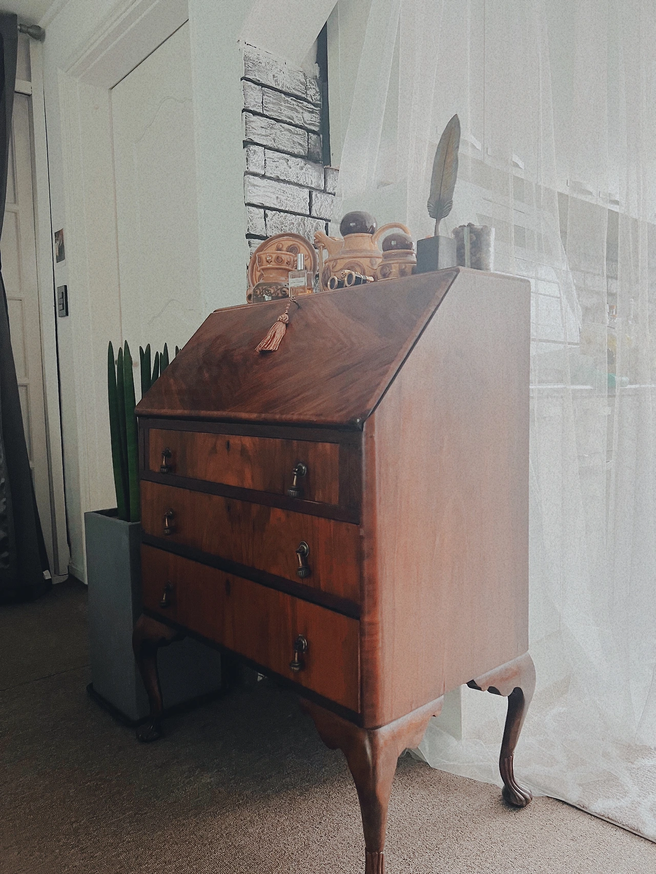우리 집 거실에 한쪽에는 100년 된 마호가니 앤틱 뷰로가 자리 잡고 있다. 이 오래된 가구가 어떤 역사를 가지고 이곳까지 흘러들어온 지는 모르겠지만, 한국의 구옥 거실에도 제법 잘 어울려주고 있다. 한껏 뽐을 내는 큰 가구들과는 다르게 수줍은 듯 조용히 자리를 잡고는, 아름다운 마호가니 나뭇결무늬를 비춰주고 있다. 부지런히 오일로 닦아 길들인 나무 냄새. 빈티지란 그런 것이다. 사람들이 들인 수고로움과 손떼가 시간이 지남에 따라 100년 가구의 찬란한 멋이 더해지는 것이다.