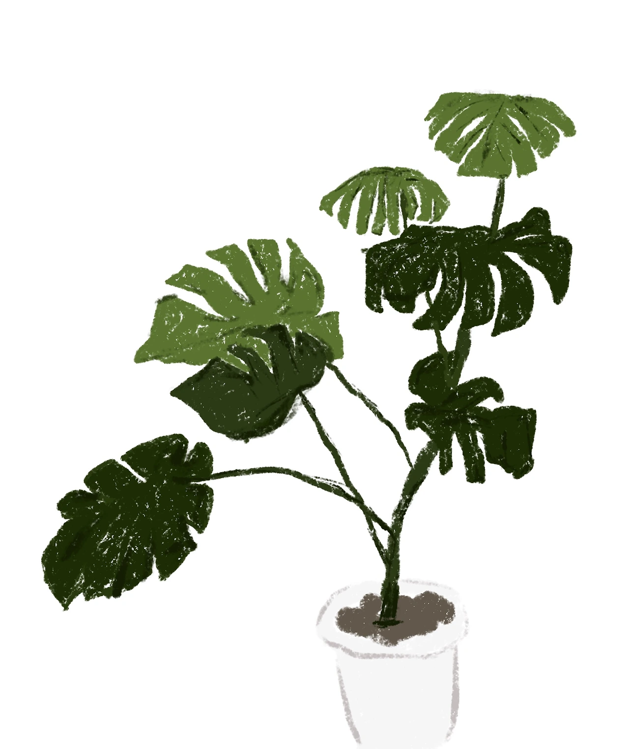 몬스테라는 그 이름 몬스터처럼 특별히 신경 쓰지 않아도 무시무시하게 잘 자라준다. 특유의 넓은 잎과 갈라진 무늬는 자유로우면서도 강렬한 인상을 준다. 나는 몬스테라를 주로 거실 중앙에 두지만, 이 식물은 침실에도 잘 어울린다. 거실에서는 공간의 중심을 잡아주며, 생명력 넘치는 분위기를 만들어준다. 밝은 햇살이 몬스테라의 잎을 타고 들어오는 아침이면, 집 안 전체가 생동감으로 가득 차는 기분이 든다. 반면 침실에 놓인 몬스테라는 조금 더 부드러운 에너지를 발산한다. 하루를 마치고 잠들기 전, 부드럽게 갈라진 잎들을 바라보며 긴장을 풀곤 한다. 몬스테라는 어떤 공간에 두더라도 그곳을 자연스럽게 감싸 안는다. 이 식물이 가진 생명력은 그저 활기차기만 한 것이 아니라, 공간에 안정감과 조화로움을 더해준다. 잎사귀가 큰 대형 식물은 크게 자리를 두고 높낮이의 재미를 둔다. 공간의 바닥부터 천장까지 활용하면 더 볼륨 있어 보이니까. 여기저기서 쉽게 볼 수 있는 국민 식물이 되었다고 하더라도 여전히 내 눈에는 질리지 않는다.