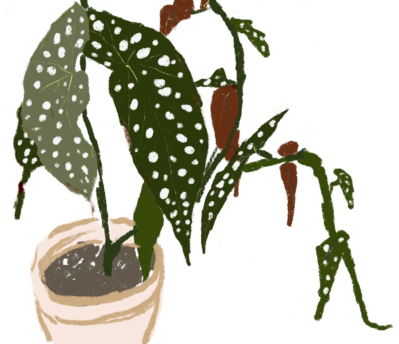 베고니아 마큘라타는 독특한 매력을 가진 식물이다. 은빛 점들이 박힌 초록의 잎을 보자마자 사랑에 빠져서 데려온 식물이다. 길게 펼쳐진 이파리도 매력적이고, 잎사귀 뒷면의 붉은 색감도 화려해서 앞뒤로 보는 재미도 있다. 아침 햇살이 들어오는 주방의 작은 공간에 놓아둔 베고니아는 요리를 하거나 차를 마실 때, 반짝이는 점들이 나를 기분 좋게 만든다. 거실에서는 다른 식물들과 대비되어 공간에 리듬감과 활기를 불어넣는다. 마치 빛과 그림자가 어우러진 작은 예술 작품처럼, 이 식물은 공간의 작은 포인트가 된다.