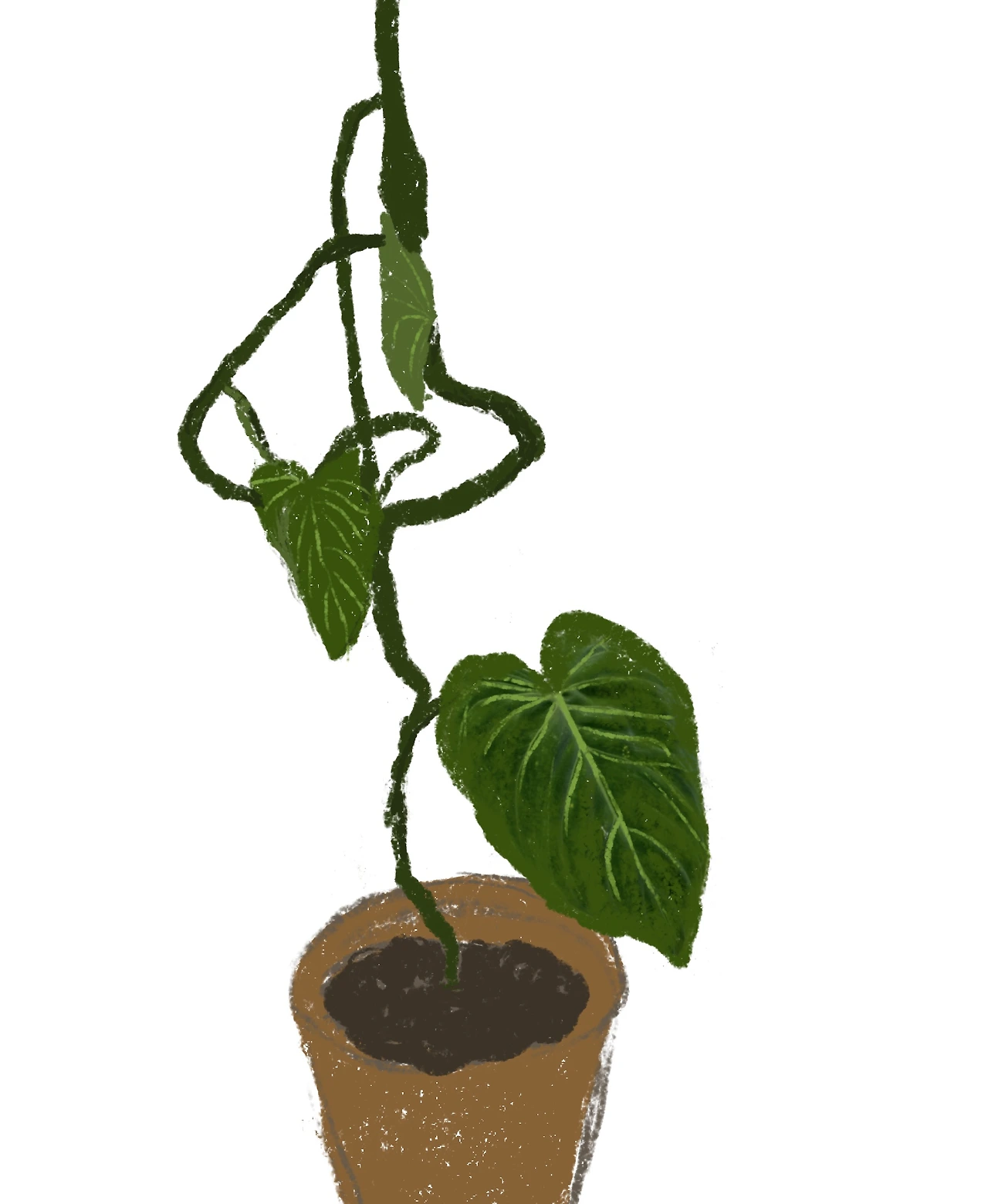 필로덴드론 멜라노크리섬은 벨벳처럼 보드랍고 커다란 잎사귀가 매력적이다. 짙고 깊은 초록색의 커다란 잎이 뻗어 내려오는 모습은 마치 공간에 흐르는 고요한 물결 같다. 나는 이 식물을 주로 거실 한편에 두지만, 그 존재감은 집 전체를 채운다. 식물대를 하지 않으면 무한대로 구불거리며 자라는데, 넓고 느긋한 잎의 곡선을 보고 있으면 일상 속의 바쁜 움직임을 잠시 멈추게 만든다. 마치 무언가를 생각하게 하는 깊이 있는 사람처럼, 이 식물은 거실에 우아한 무게감을 더해준다. 필로덴드론 멜라노크리섬을 두고 커피를 마시거나 책을 읽을 때면, 문득 그 잎의 형태와 색감에 눈길이 머문다. 무심한 듯 늘어진 그 잎사귀들은 공간에 은은한 쉼을 선사한다. 작업실에도 이 식물을 놓아두는데, 여기는 또 다른 매력을 발휘한다. 창의적인 작업에 몰두할 때, 그 고요한 초록의 존재가 오히려 집중력을 더해준다. 복잡한 생각들이 얽힐 때, 이 식물의 잎을 따라 시선을 움직이면 생각이 정리되곤 한다.