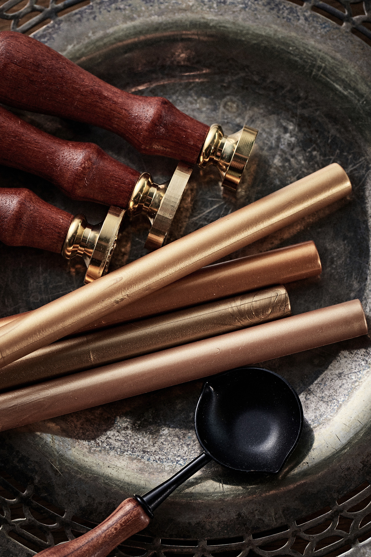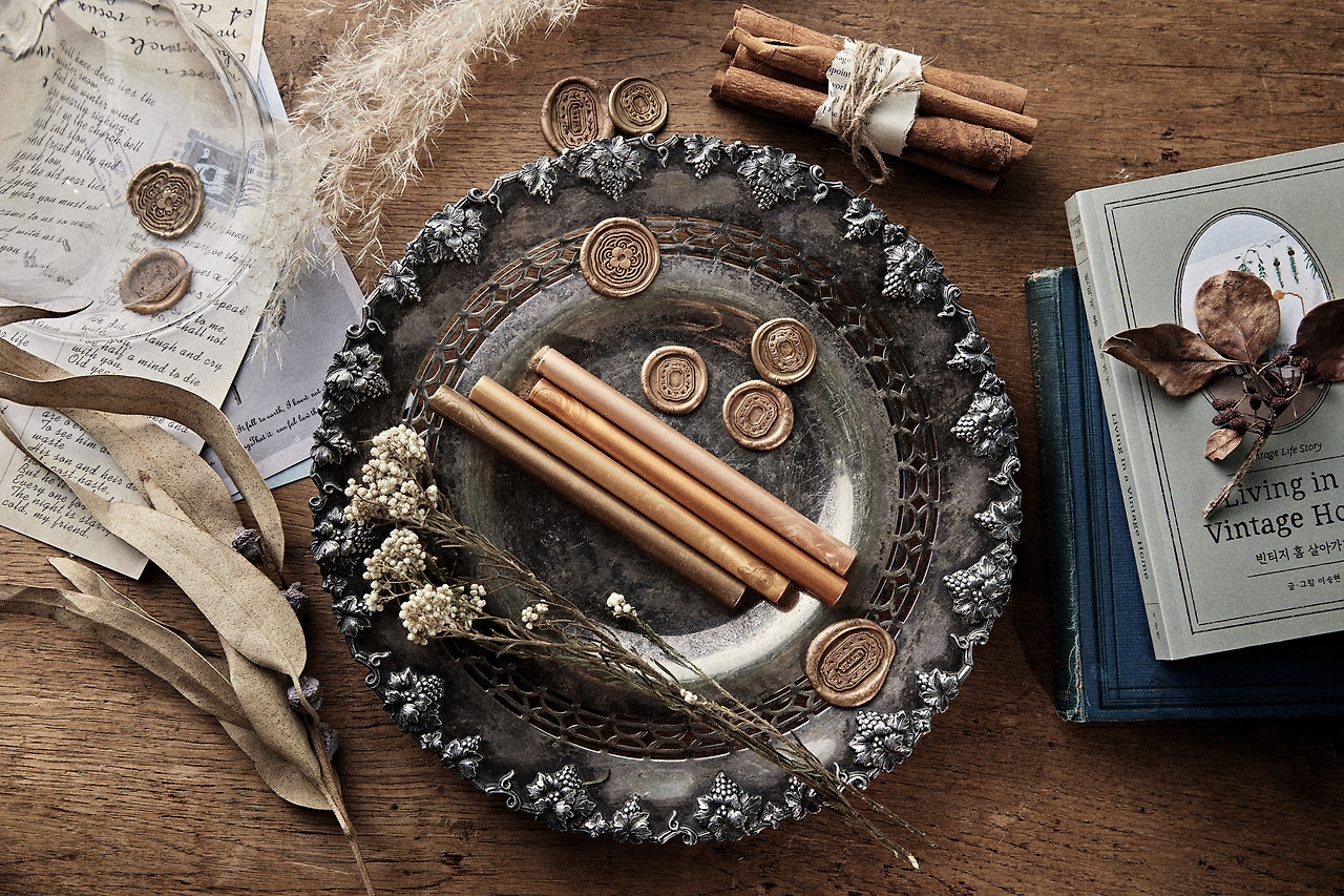스탬프에 이어 두 번째 아이템은 골드톤의 실링왁스 스틱 4개를 믹스해 구성했다. 빛나는 골드 컬러가 담긴 왁스는 편지와 초대장을 한층 더 특별하게 만들어준다. 다양한 조색이 가능해, 같은 스탬프라도 매번 새로운 분위기를 연출할 수도 있다.