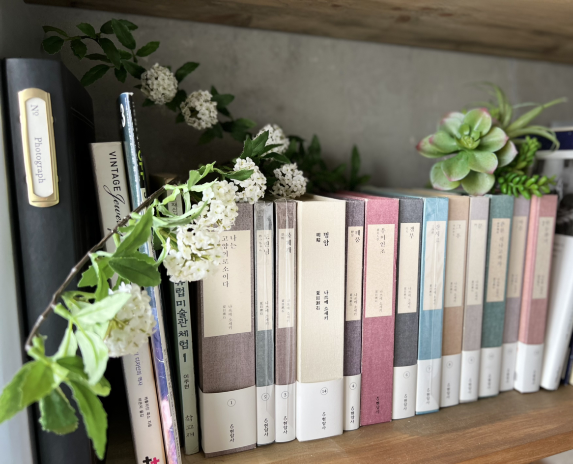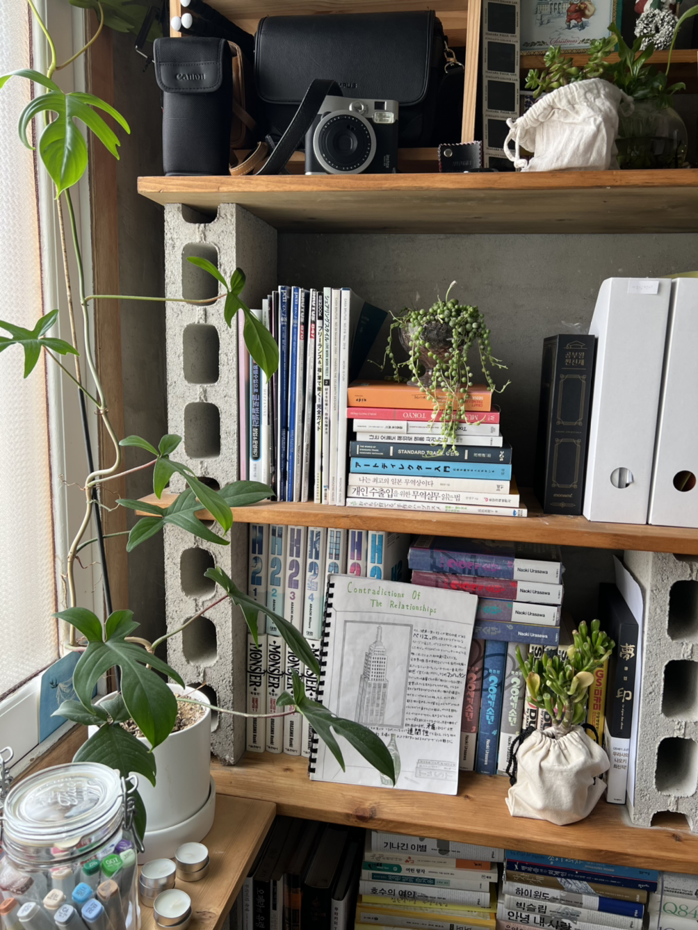 책은 장르별로 분류해놓는다. 전공서, 여행서, 소설, 인문서, 만화책, 서류 등으로. 책을 분류할 때 색깔별이나 크기별로 정하기도 한다는데 그건 소량의 책만 가지고 있다거나 아니면 하나의 장르가 아주 방대한 양일 때만 가능한 것 같다. 우리처럼 다양한 장르의 책을 적정량으로 가지고 있다면 장르별로 분류하는 게 좋은 방법인 것 같다. 찾기도 쉽고 취향도 한눈에 알 수 있다. 보유하고 있는 책들도 장르별로 양이 서로 다른데 양이 많은 건 한 칸이나 두 칸을 다 쓰기도 하고. 양이 적은 건 수직과 수평으로 골고루 진열해두고 남은 공간은 식물을 두거나 수집품들을 적절히 올려두었다. 하나의 장르도 더 파고들어 진열하기도 한다. 예를 들어 소설은 처음에는 대륙으로 나누고 그다음에는 나라, 그리고 작가별로 나눈다.