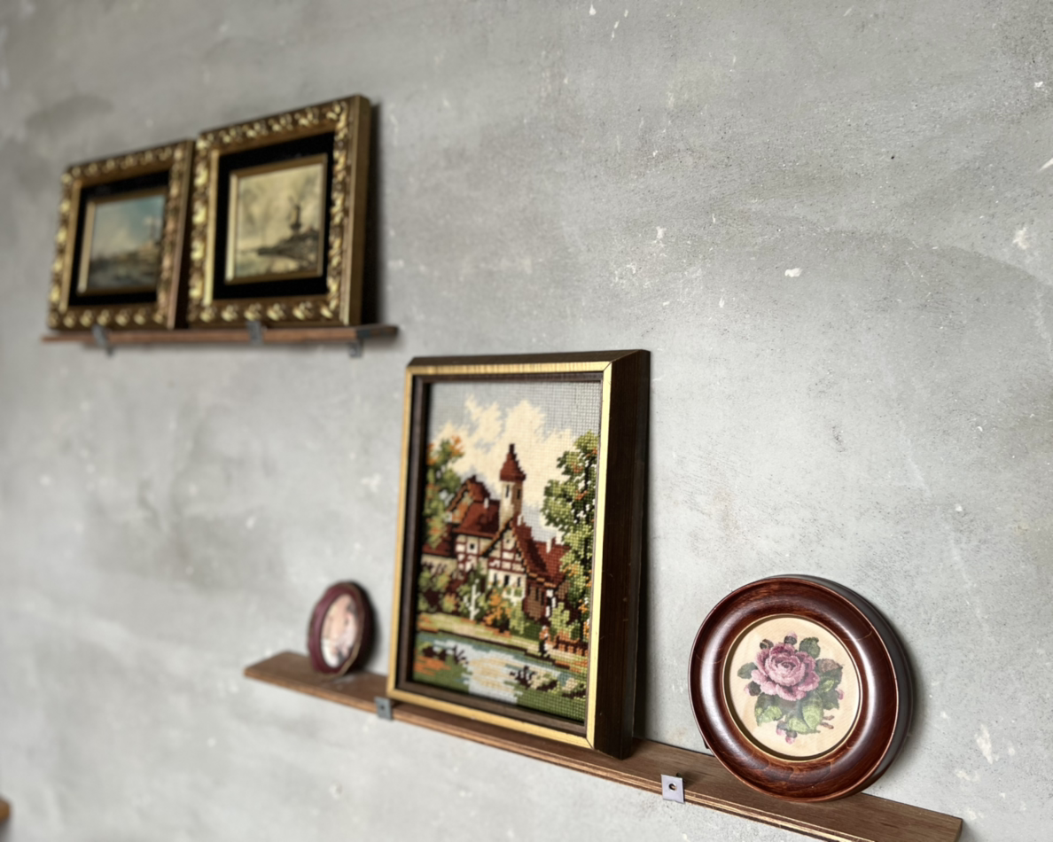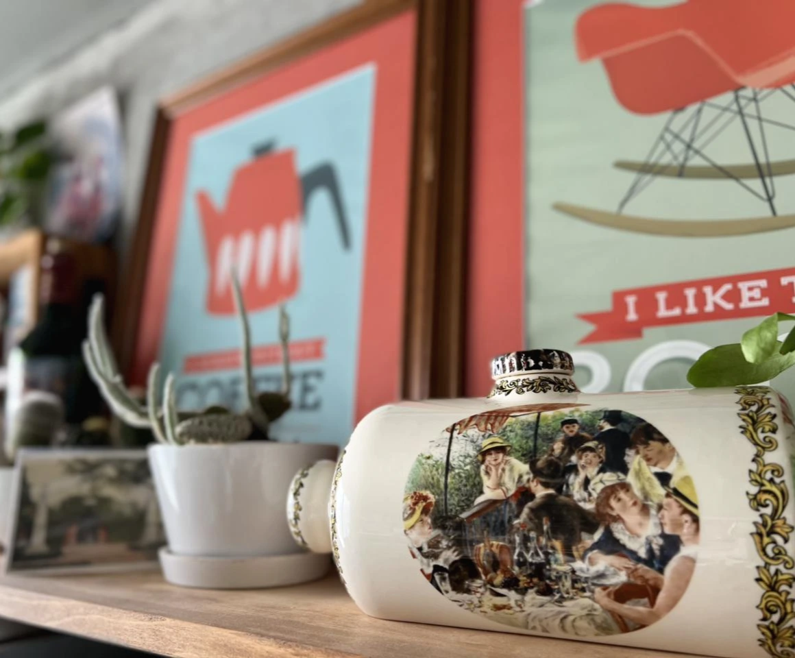 액자나 예술서, 빈티지 엽서들도 여기저기 진열해둔다. 르누아르의 그림이 그려진 빈티지 물병은 지금은 뚜껑이 열리지 않아 사용할 수 없는 아이템이지만 너무 예뻐서 오브제로 두고 있다. 유럽에서 온 작은 빈티지 액자들도 벽 한쪽에 모아두었다.