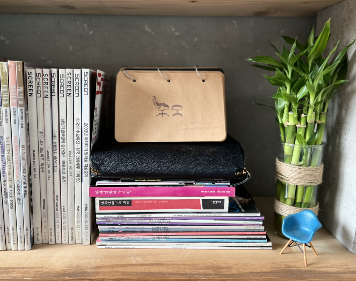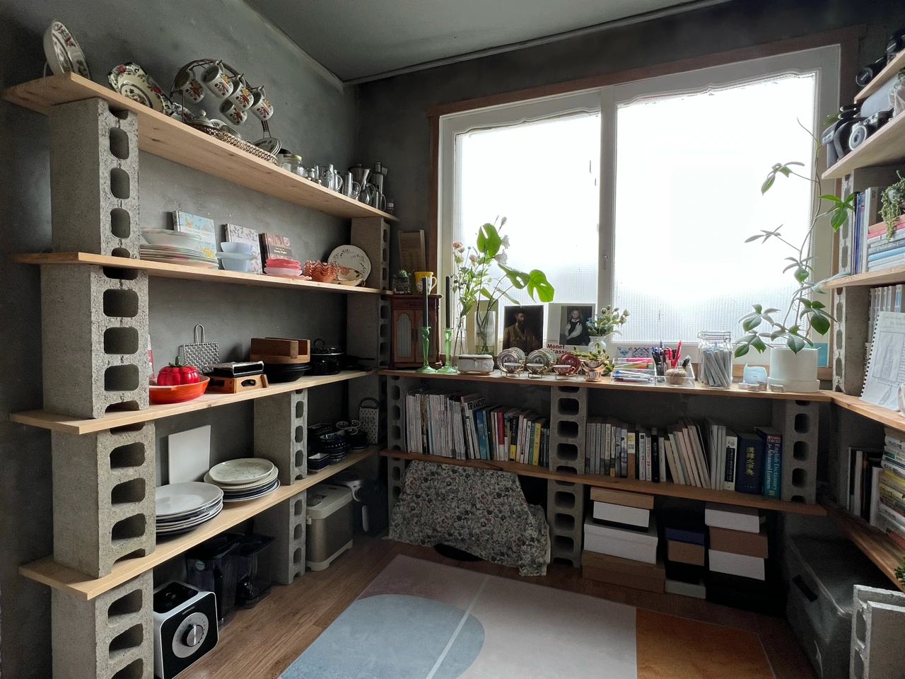 사실 이 방의 이름은 계속 바뀌었다. 처음에는 책과 나의 작업물을 두고 작업실로 쓰려고 했는데 데스크를 두어도 이 방까지 와서 작업을 잘 안 하게 되더라. 책도 거실이나 침실 소파에서 읽는 게 더 좋았고. 게다가 그다지 크지 않은 주방 때문에 주방용품을 수납할 곳도 필요했고, 문구류나 카메라, 제가 모은 빈티지 수집품들도 진열해야 했다. 그래서 데스크를 치워버리고 수납장을 더 올려 ㄷ자 모양의 수납장을 만들었다. 서재에서는 가볍게 앉아서 책을 고를 정도만 되면 괜찮다고 생각해서 의자만 하나 두었다. 이제는 책을 간단하게 보거나 진열해 놓은 물건을 찾으러 가는 목적이 큰 것 같다.