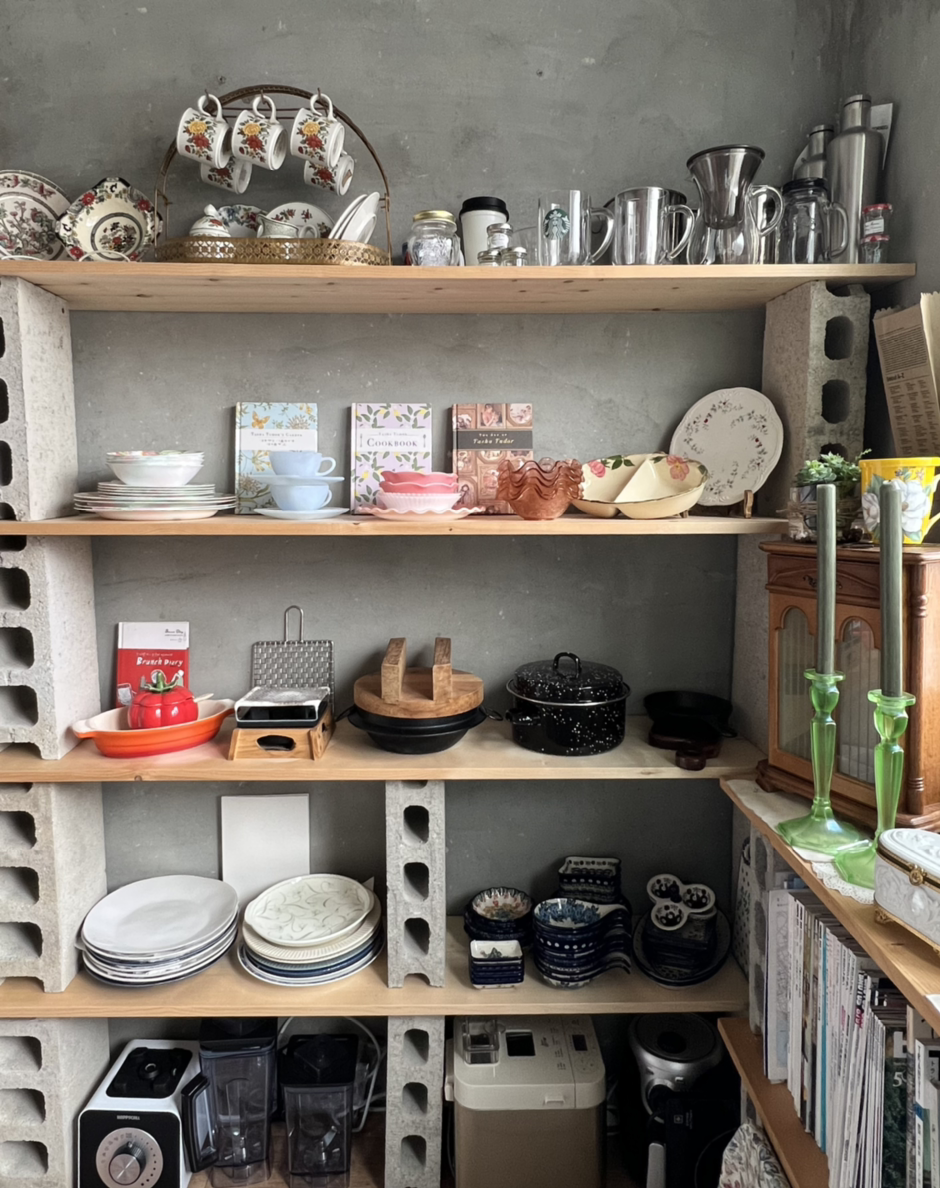 주방이 그리 크지 않기 때문에 평소에 잘 쓰는 식기들은 주방에 그렇지 않은 식기들을 서재 한쪽 코너에 보관한다. 믹서나 제빵기 같은 주방 도구들은 바닥에 두고 커피용품들이나 조리도구들도 코너를 만들어둔다. 손님들이 올 때나 특별한 날 꺼내 쓰는 그릇들도 적절히 배치해 둔다.