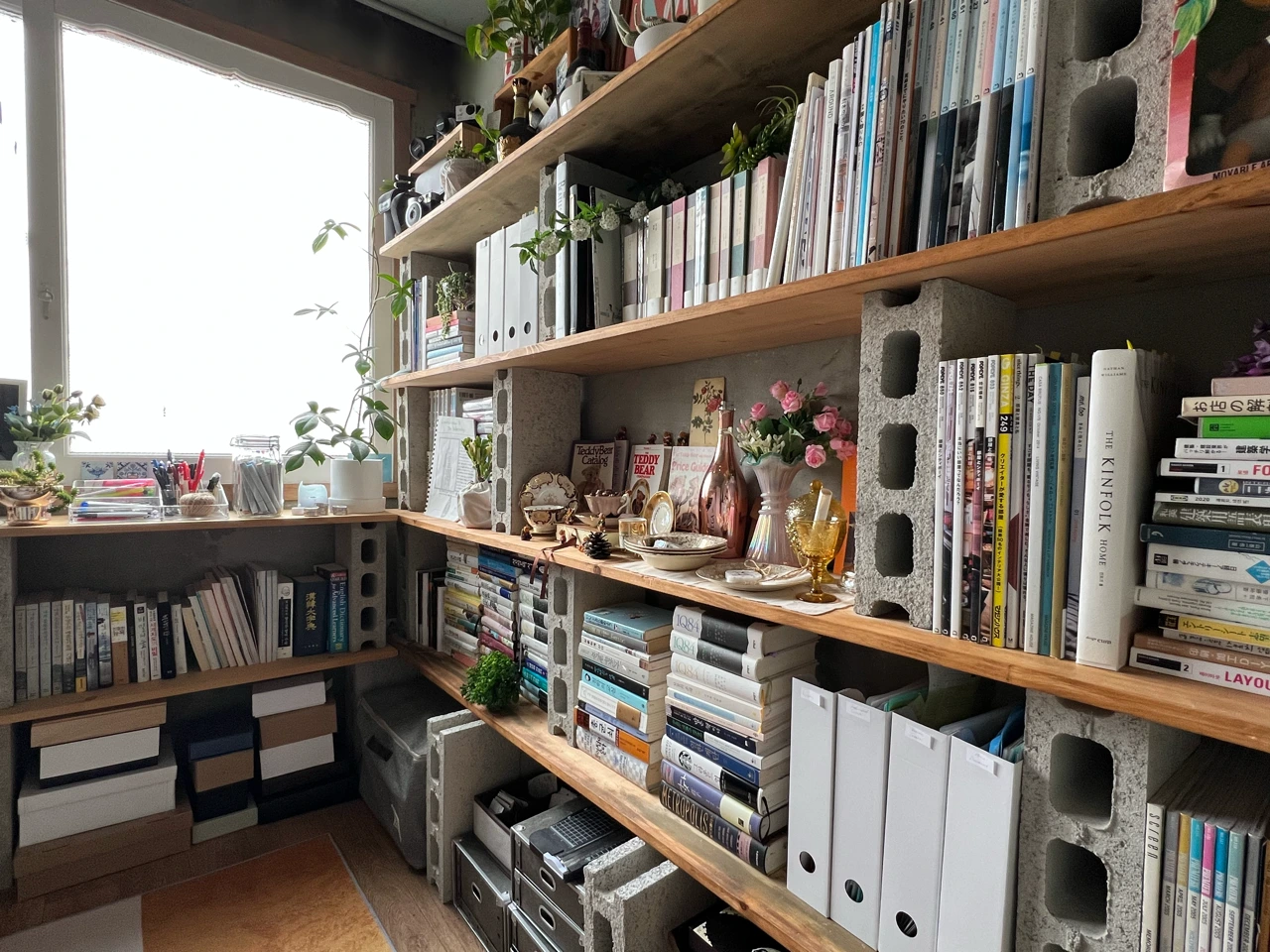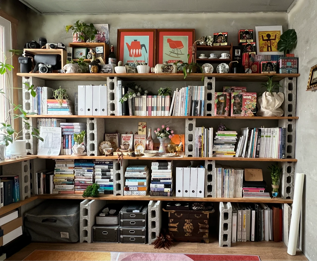 전셋집이라 얼마나 살지도 모르는 입장에서 시스템 수납을 짜기에는 뭔가 아까워서 셀프 수납장을 만들기로 했다. 방 크기에 맞춰 자른 목재와 시멘트 블록만 있으면 이것들을 쌓아 수납장을 만들 수 있다. 사실 이 방법은 내가 일본에서 혼자 살 때부터 쓰던 것이다. 이사를 많이 하다 터득한 것. 손쉽게 방 사이즈에 맞춰 제작할 수 있다는 게 가장 큰 장점이다.