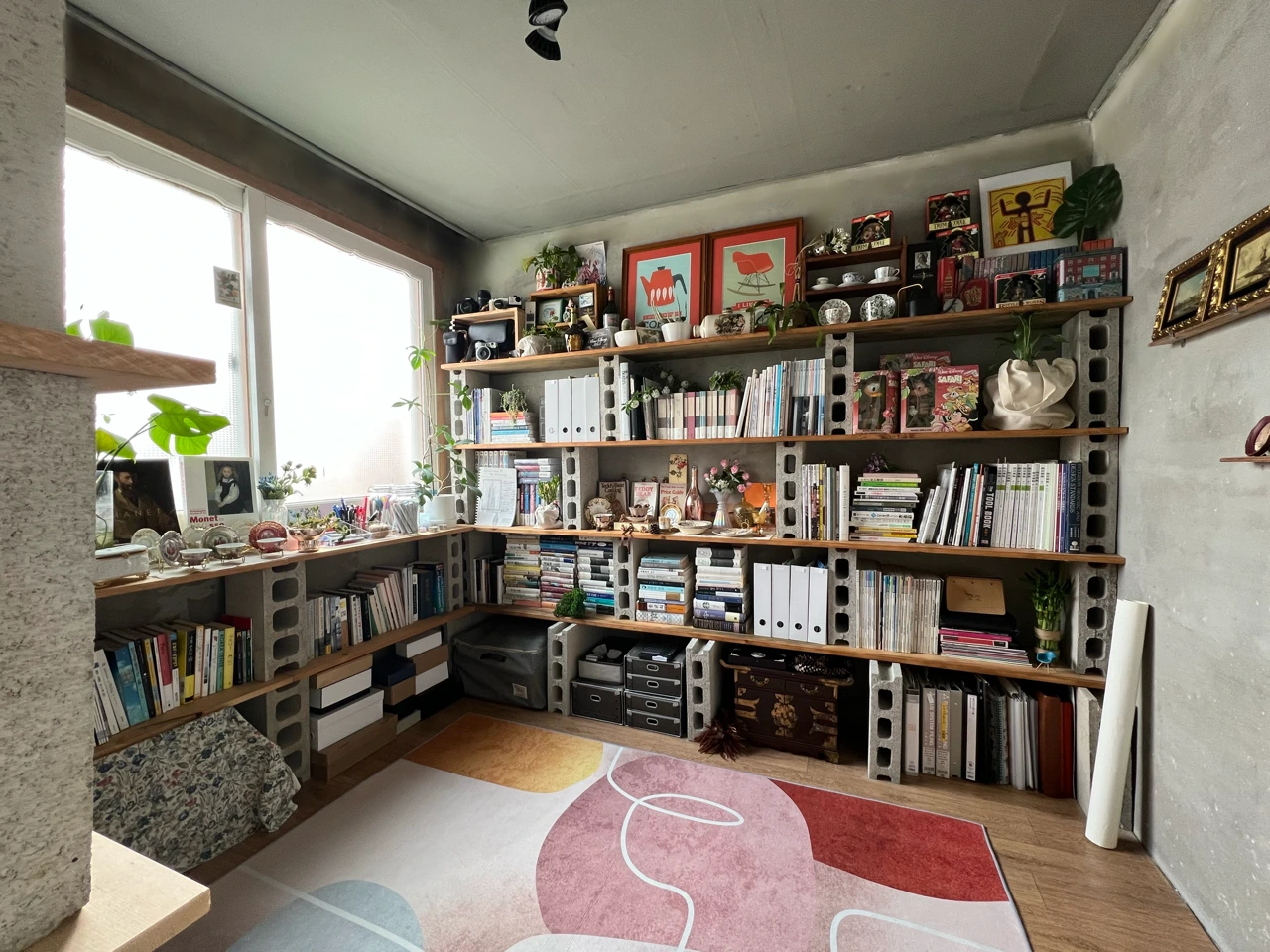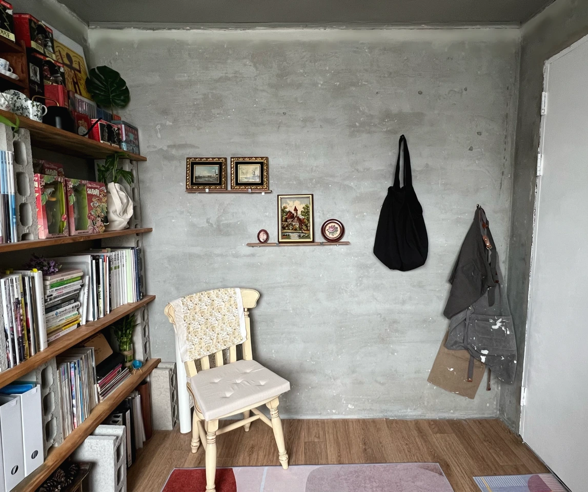 서재는 주방과 함께 우리 집에서 가장 볕이 잘 드는 공간이다. 커튼을 달까도 여러 번 생각해봤는데 창문으로 들어오는 햇빛을 굳이 가리고 싶지 않더라. 식물을 많이 두고 작은 온실처럼 빛을 활용하기로 했다. 서재도 벽지를 모두 뜯어내고 콘크리트를 노출시켰는데 천장틀은 보수도 하고 창틀이 좀 지저분해서 창틀에는 목재로 틀을 만들었다. 서재는 아침 볕이 들 때 가장 화사한 공간이다.