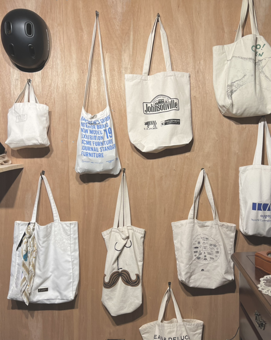 보기 싫은 미운 제품들은 전부 에코백에 넣어서 나왕 합판 벽에 걸어두었다. 많은 사람들이 그렇듯 나도 에코백이 너무 많은데 이걸 버리기도 아깝고 모으기도 처치곤란인 것도 많았다. 그래서 에코백에 잡동사니들을 종류별로 넣어서 보관했다. 네일 제품만 담아두거나 미용가전들을 담아 보관하거나 가끔 사용하는 것들을 넣어서 보관한다. 보기에도 깔끔하고 좋았다.