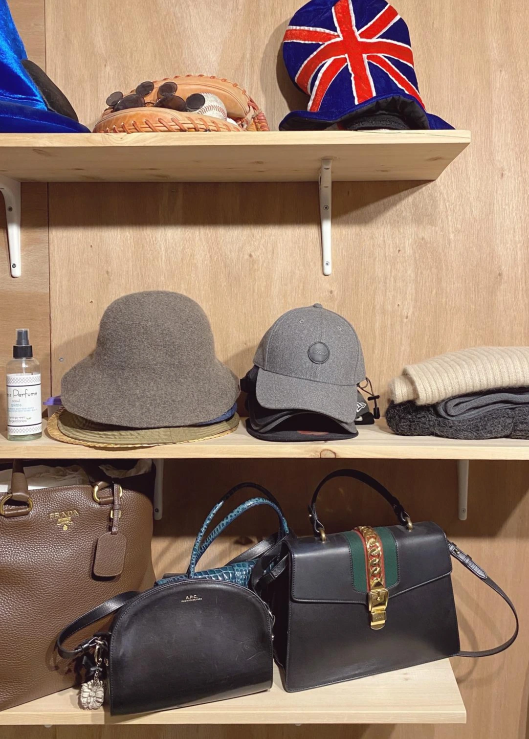 드레스룸은 워낙 작은 규모의 방이었기 때문에 방안에 옷장을 둔다는 생각보다는 방 전체를 하나의 옷장으로 보는 워크인클로짓(Walk in Closet)으로 해야겠다고 생각했다. 전셋집이라 얼마나 살지도 모르는 입장에서 시스템 수납을 짜기에는 돈이 아깝더라. 그래서 직접 구매한 목재로 찬넬 수납을 설치해 가방이나 모자 같은 패션 아이템들을 올려놨고, 이동식 행어를 설치해 옷을 걸었다. 언제든지 조립하고 해체해서 들고 다닐 수 있으니까.
