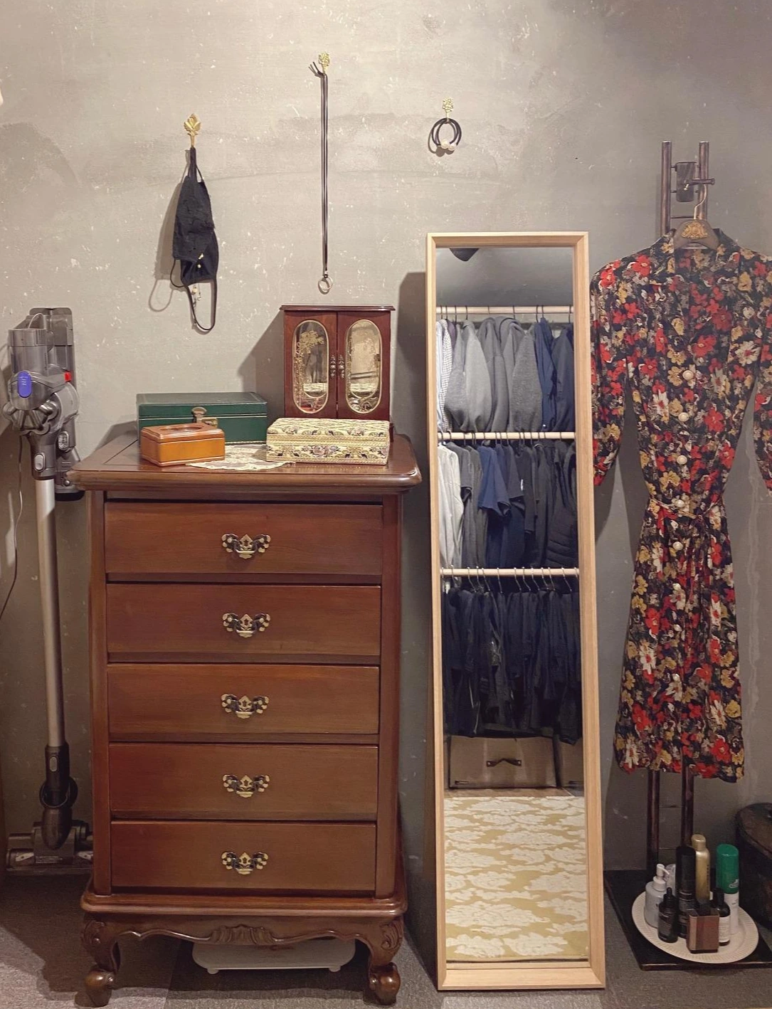 속옷이나 양말은 빈티지 서랍장에 넣어서 보관하고 있고, 서랍장 위에 주얼리 박스들을 모아두었다. 전신 거울은 침실과는 달리 얌전한 디자인으로 두었다. 이방에는 이 정도 사이즈가 더 잘 어울릴 것 같았거든. 전신 거울 옆에는 단독 행어를 두고 다음날 입을 옷을 미리 걸어둔다. 그 아래에는 단출한 화장대를 두었다.