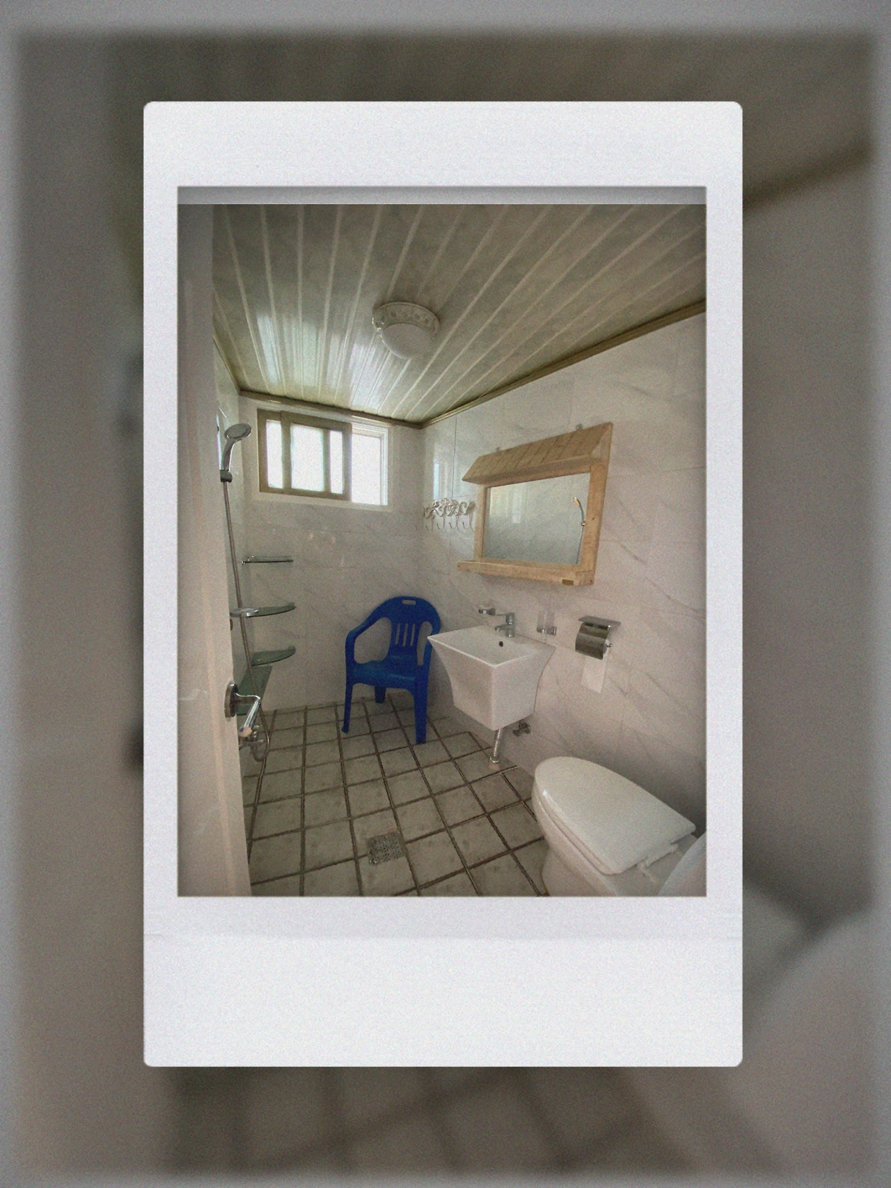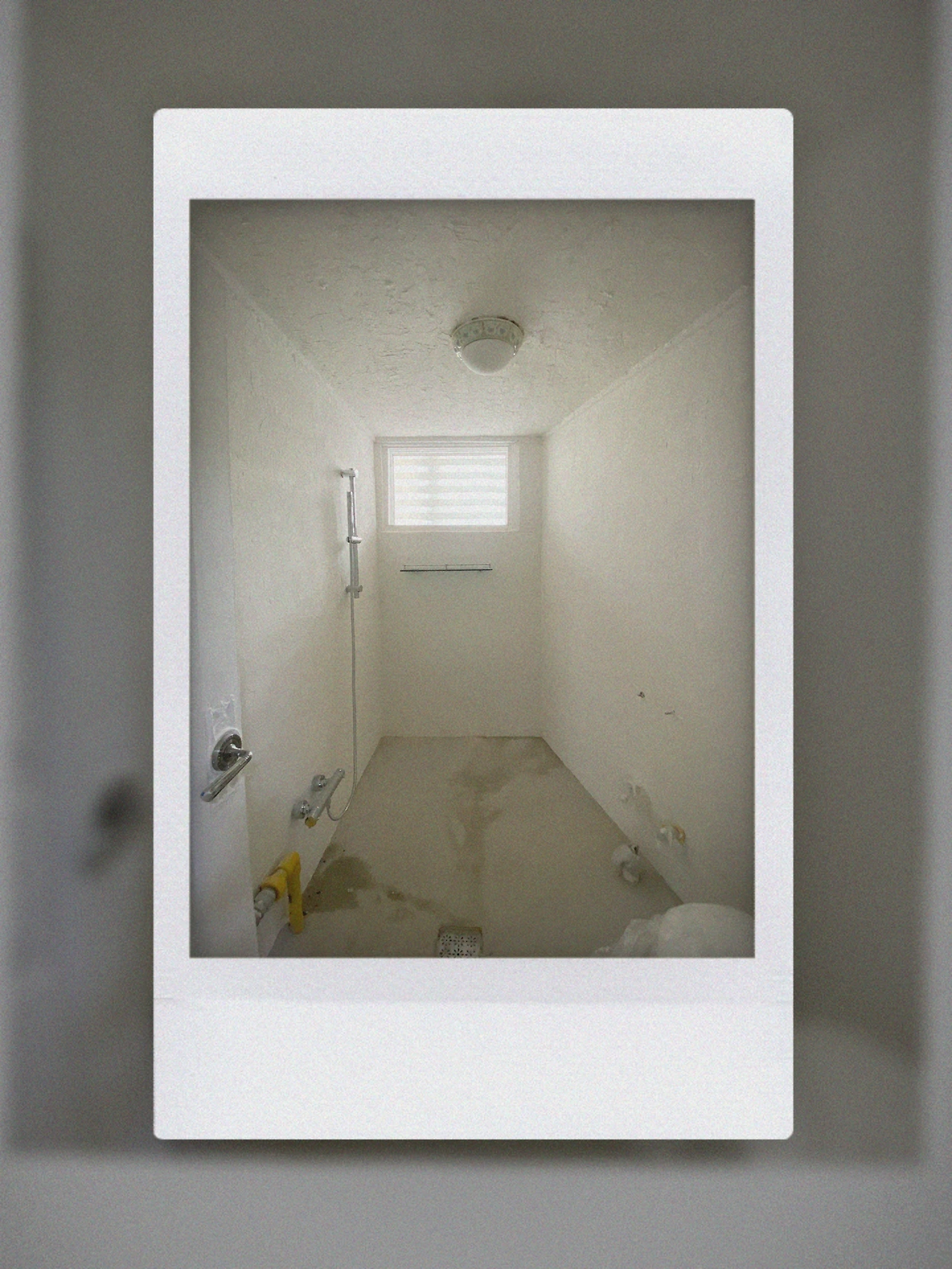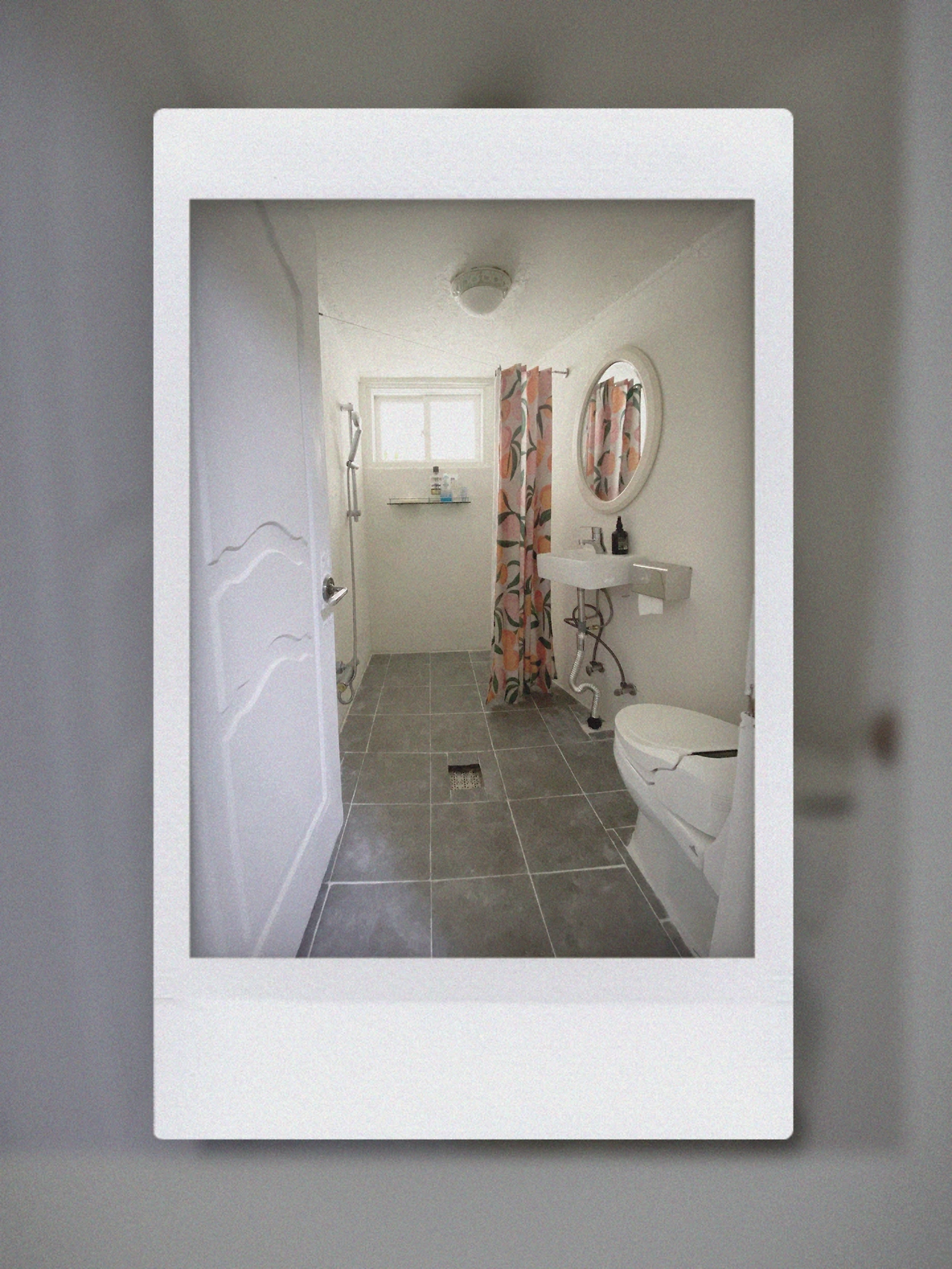 집 자체는 마음에 들었기 때문에 욕실은 내가 할 수 있는 만큼 셀프 개조를 해보기로 했다. 일단 좁은 욕실 안에 있는 너무 많은 선반과 큰 세면대, 그리고 어울리지 않은 거울은 모두 떼어내기로 했다. 천장과 벽을 모두 화이트 방수 퍼티를 발라 넓고 밝게 쓰기로 했다. 욕실 샤워기도 새 것으로 교체했고, 세면대는 작은 욕실 사이즈에 맞는 작은 세면대로 바꿨다. 너무 큰 나무 프레임의 거울은 심플한 타원의 화이트 벽거울로 교체했다. 바닥은 더 크고 심플한 그레이 톤의 방수 타일로 교체했다.