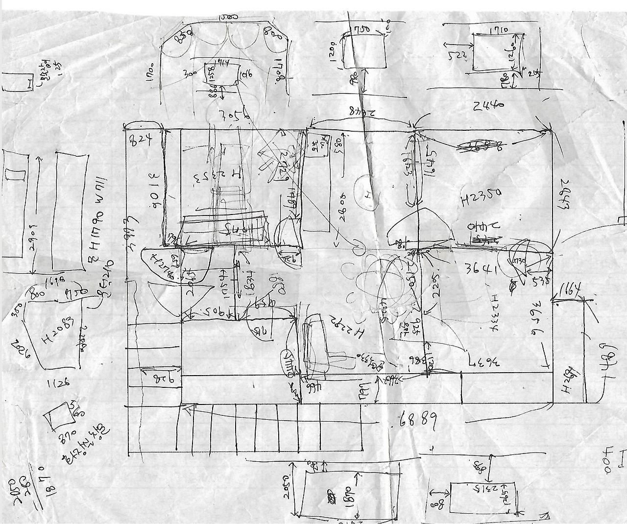 빠른 시간에 일을 끝내드려야 할 것 같아서 A4용지 한 장에 이것저것 마구 휘갈겨 썼다. 대충 방의 위치를 알고 있었기 대문에 미리 베이스를 그려놓고 사이즈의 수치를 추가로 써 내려갔다.