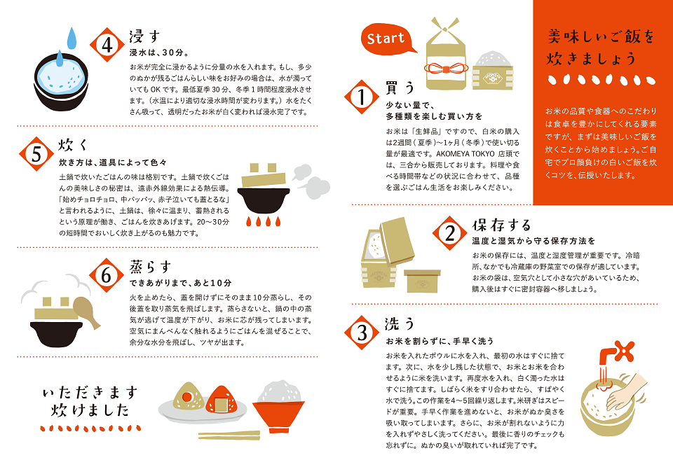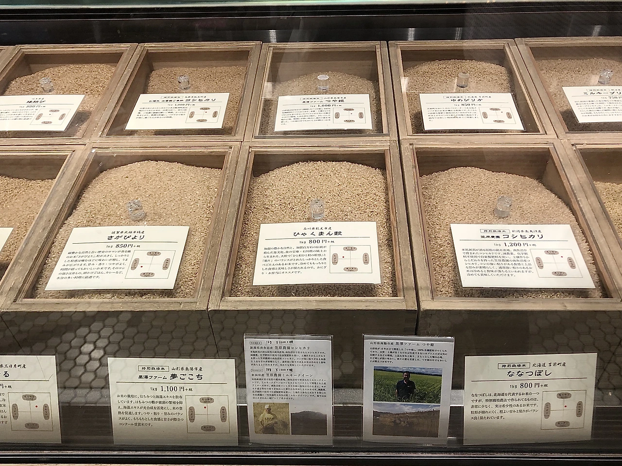 일본 전국에 있는 30여 종의 쌀을 취급하고 있고, 매장에 있는 쌀을 현미, 삼분도미, 오분도미, 칠분도미, 백미로 도정해 제공하기도 한다. 각 쌀의 특징, 밥 짓는 법 등의 정보를 제공하고, 밥과 함께 먹을 반찬, 국 의 재료와 조미료 뿐만 아니라 밥을 지을 도구, 차릴도구, 함께 할 도구 모든 것을 제공한다.