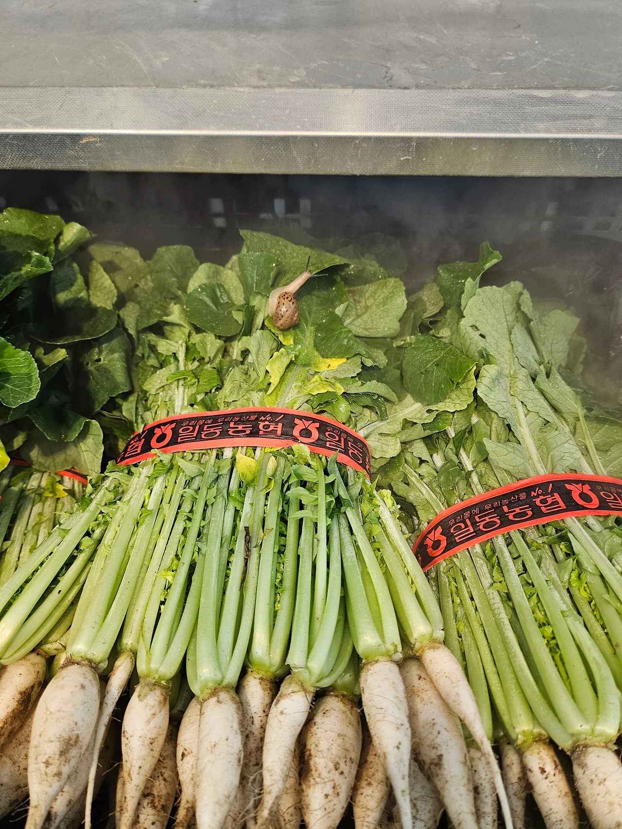 마트에 갔는데 열무에 우뚝 큰 달팽이가