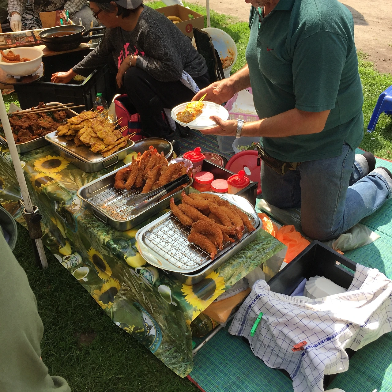 인터넷으로 살짝 찾아보니 태국 사람들이 옹기종기 모여 향수병을 달래려 일요일에 공원에서 만나 음식을 나누던 것이 커지고 커져 지금의 규모가 됐다고 한다. 아마도 베를린에 적응하던 사람들일 테니 가족이 늘고 친구들을 부르고 하며 규모가 조금씩 커지지 않았을까 싶다. 꼭 이 장소가 아니라도 주말의 화창한 날씨에, 소풍과 그릴이 허용된 공원에서는 수많은 사람들이 야외에서 나름의 행복한 시간들을 보내고 있는 분위기를 보면, 사실 이 행사가 아주 놀랍거나 그렇지는 않다. 다만 그 주체가 태국 사람들이라는 것, 그들의 음식을 다양한 분위기로 판매한다는 점 등이 흥미로웠다. 얼마 전 어느 한국의 TV 프로그램을 통해 본 미국의 '푸드트럭'과 비슷한 분위기였는데 가장 큰 차이점은 그들과 달리 '트럭'이라는 기동력이 없다는 것이다. 자판을 널고 음식을 바로 조리해 판매하는 것이 한국의 재래시장을 떠올리기도 했다. 절차상으로는 누구나 등록하면 장사를 할 수 있다고 하니 태국 음식뿐만 아니라 베트남 음식, 심지어 한국 음식까지 맛볼 수 있다. 사실 이 정도 규모의 행사가 매주 열리려면 베를린 시도 협조를 해야 하고, 방문하는 사람들도 열려 있어야 한다. 잔디밭을 배경을 심지어 한쪽에선 타이마사지를 하기도 한다. 공원 전체가 주말에는 아시아의 색깔을 입는 셈이다. 왠지 부럽기도 하고, 심리적 안정감도 느꼈다. 나와 같은 다수의 외국인들이 한 곳에 모여 화창한 햇살에 주말을 즐기는 그 모습이 유난히 보기 좋게 느껴졌다. 아시아 사람들 피해 다니던 그때의 나였다면, 아마 이곳에는 오지도 않았을 것이다.